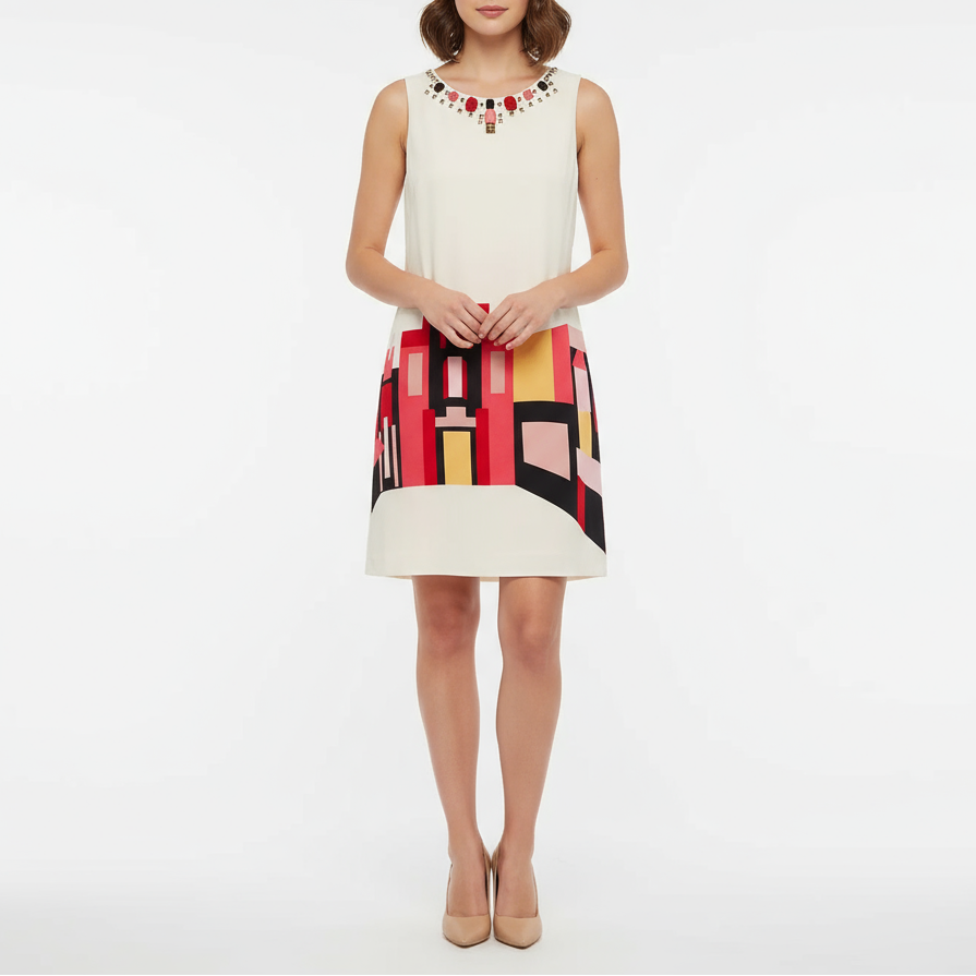 Vince Camuto Sheath Dress Womens 4 Multicolor Villa Print Lined Beaded Back Zip