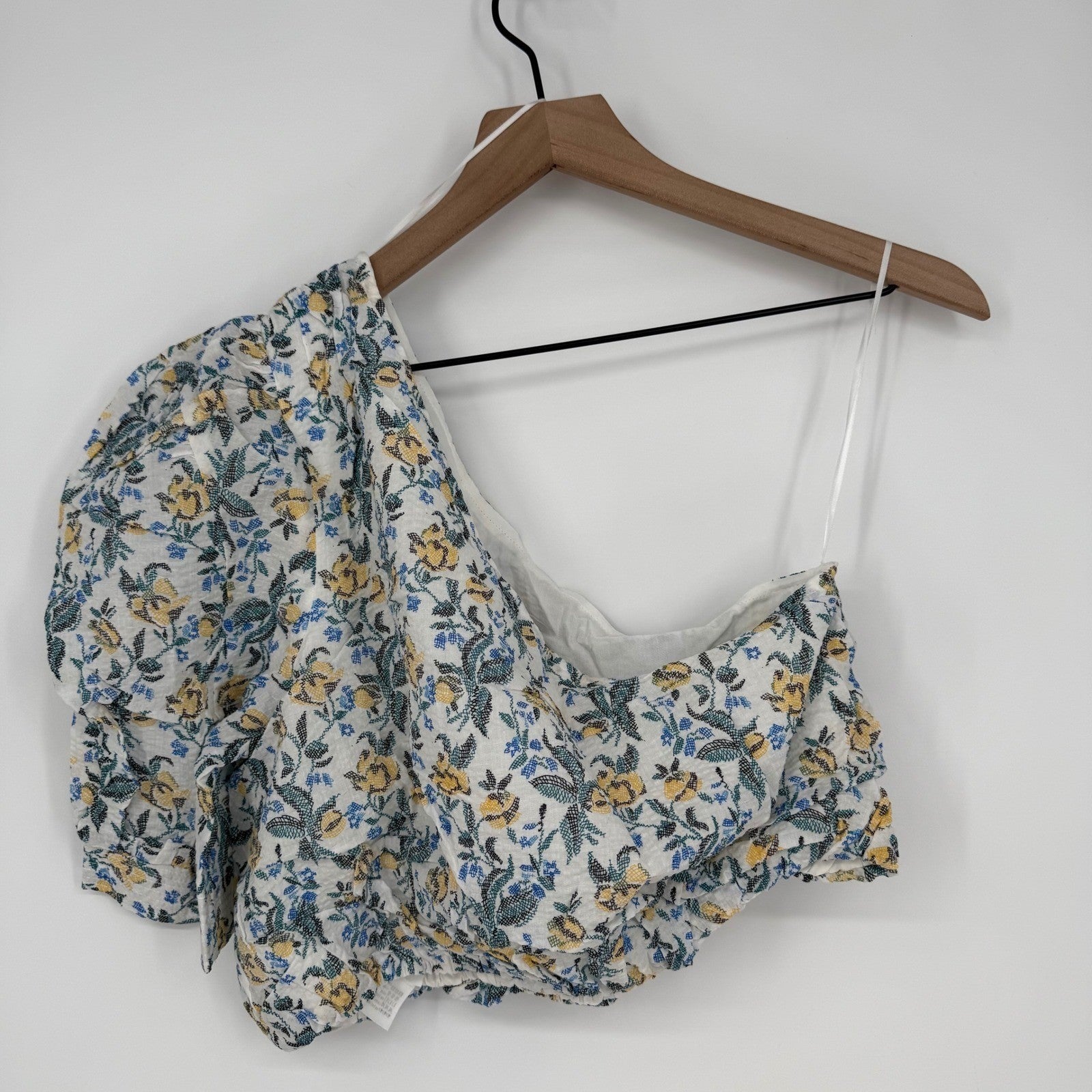 Keywords: floral blouse, crop top, one shoulder top, En Saison, womens blouse, summer top, floral print, yellow blouse, blue blouse, white blouse, size M, boho chic, festival wear, party top