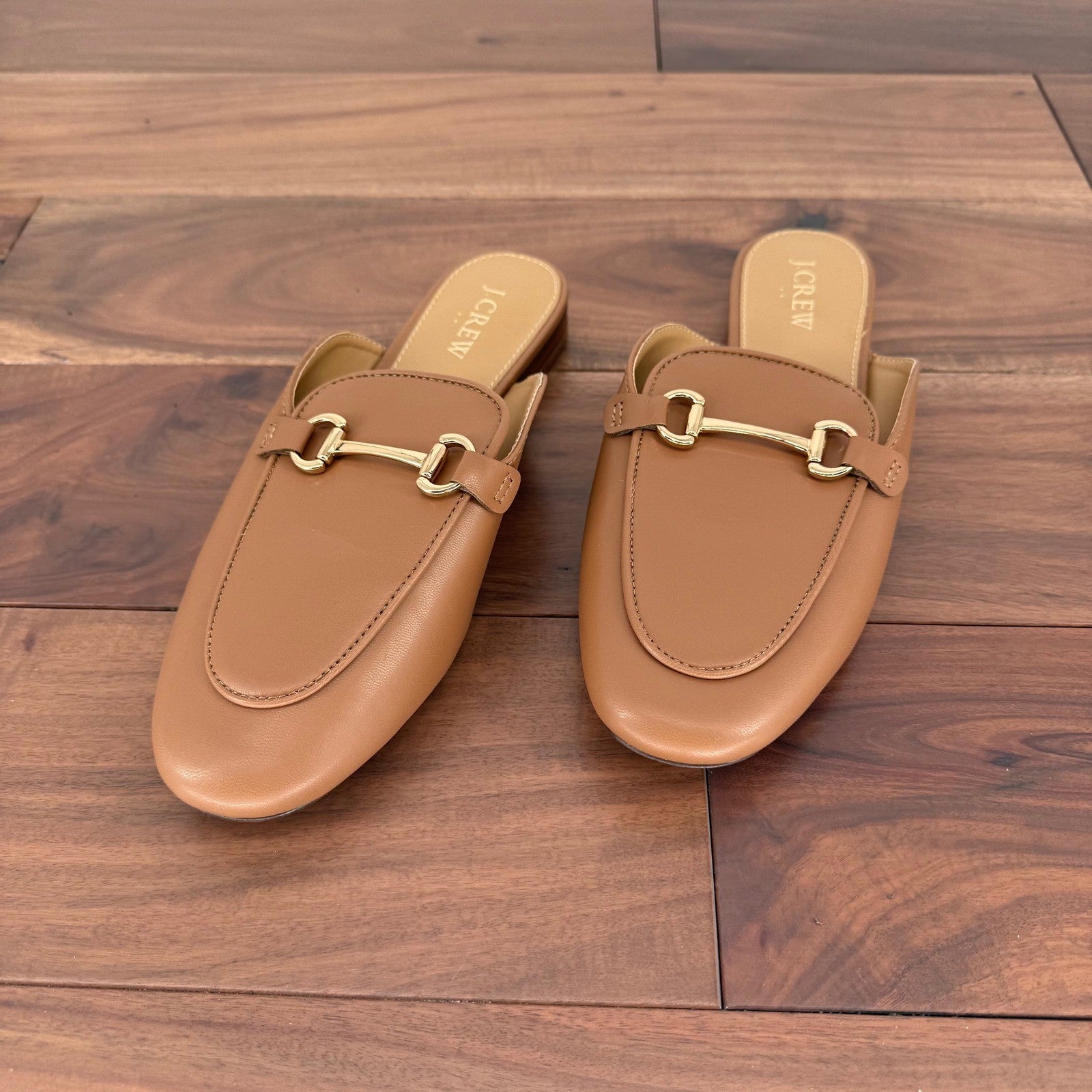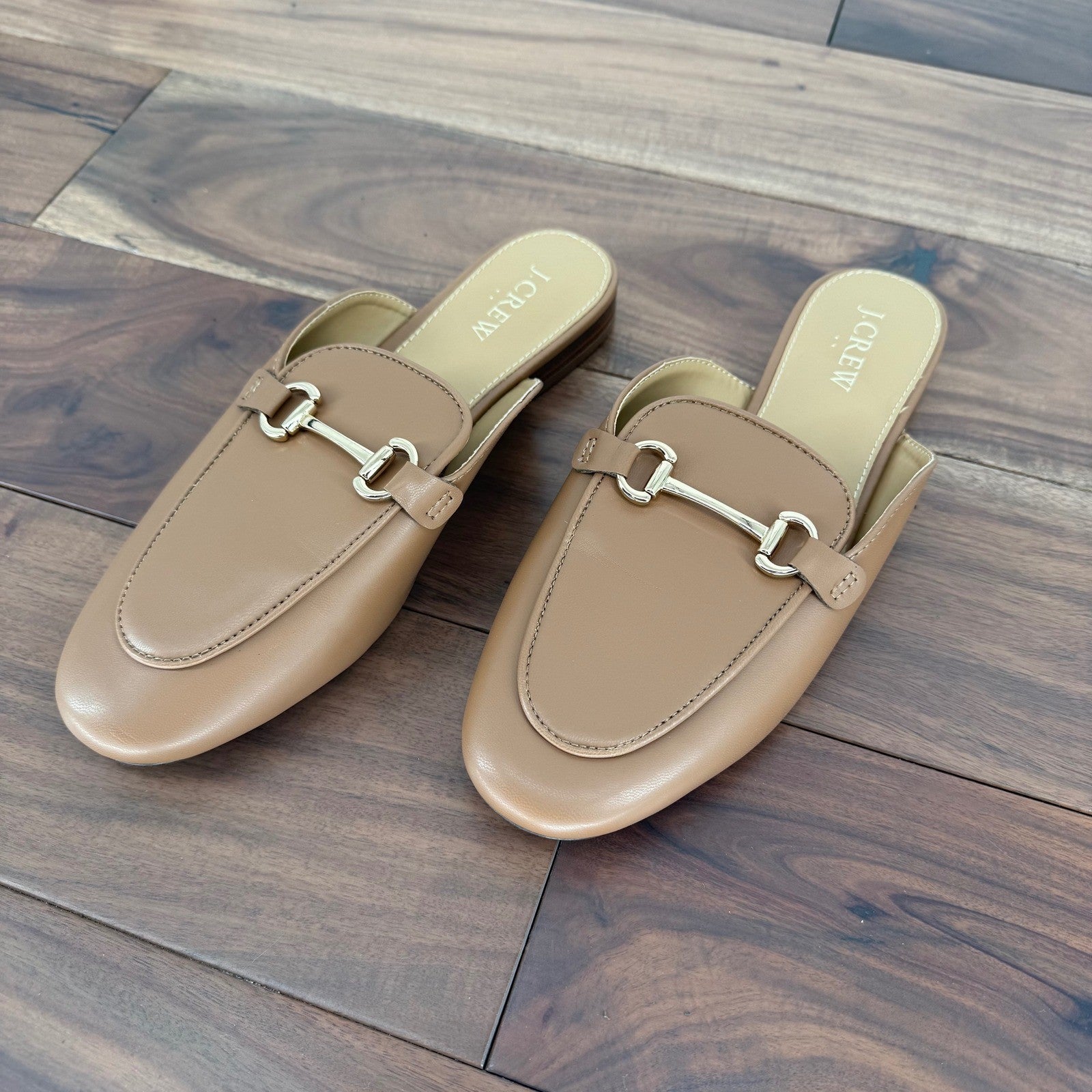Keywords: J Crew mules, tan leather loafers, horsebit flats, slip on shoes, women's mules, pointed toe flats, designer loafers, chic footwear, business casual shoes, preppy style, equestrian shoes, gold hardware, designer mules, comfortable flats