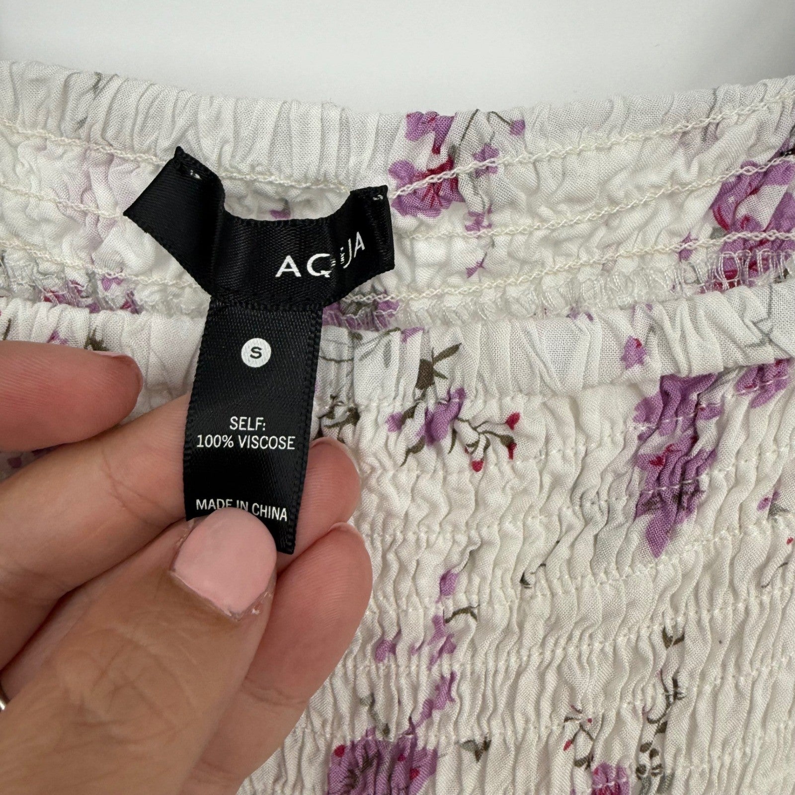 Aqua Maxi Dress Floral Print White Black Purple Smocked Bodice Tie Straps Size S