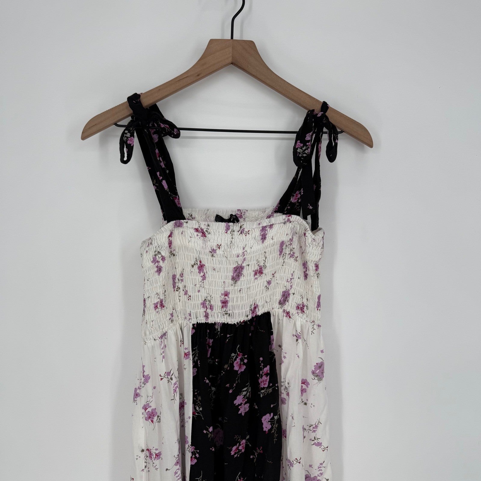 Aqua maxi dress with a smocked bodice and adjustable tie straps. This dress features a white base adorned with a delicate purple floral print, contrasted by a black panel in the center featuring a darker floral pattern. The tiered hem adds a flowing silhouette. Perfect for a summer picnic, a casual day out, or a vacation getaway.