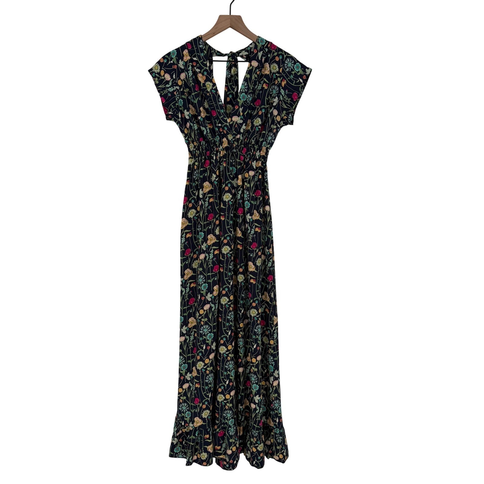 BETINA Floral Print Maxi Dress Deep V Neck Smocked Waist Tie Back Navy