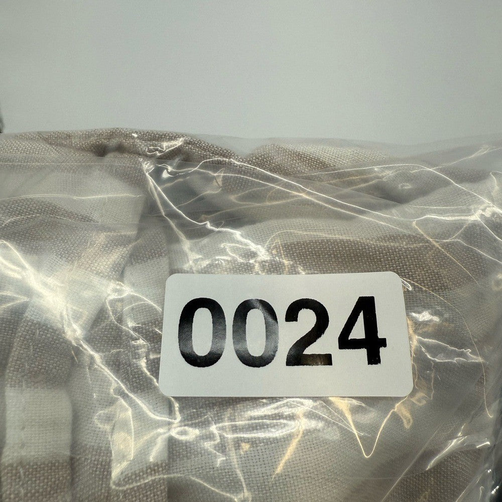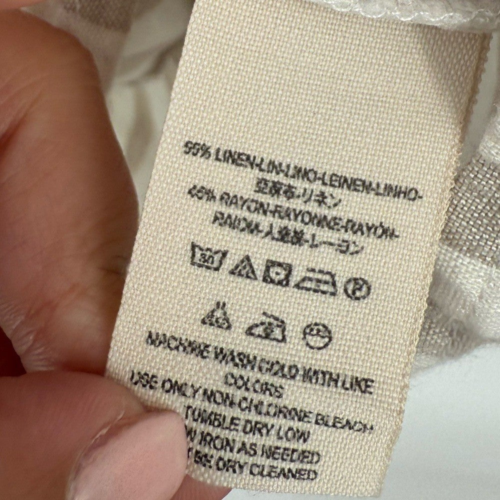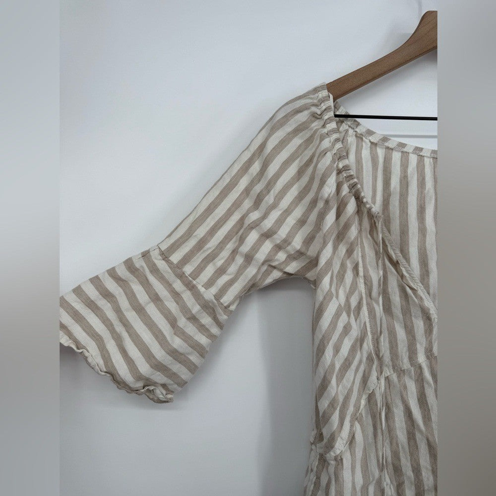 Split v scoop neck with tassel tie, 3/4 flared sleeves, pullover style, hand pockets, mini / tunic length. Can be worn off or on the shoulder. Woven linen-rayon in a neutral taupe / off-white stripe.