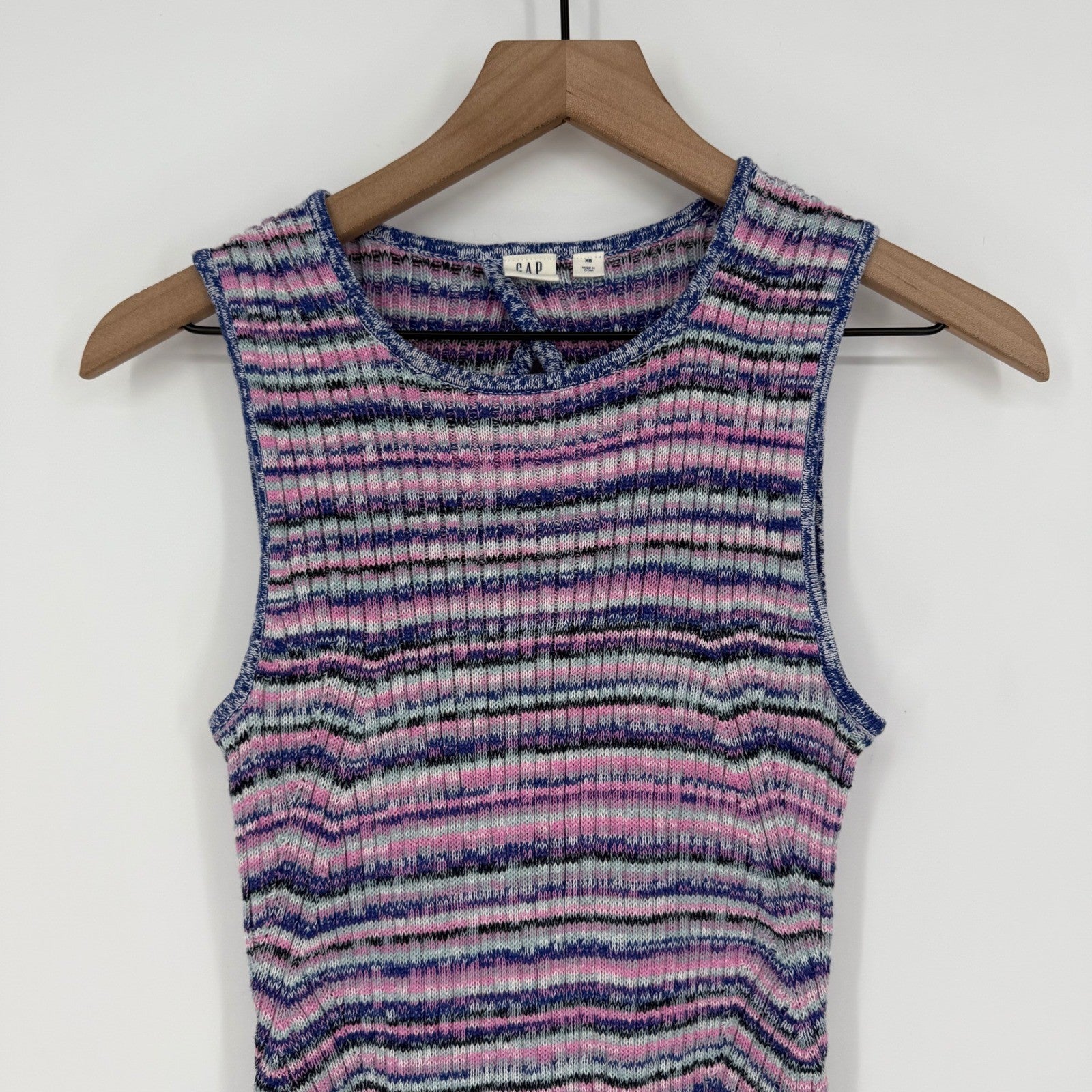 Keywords: GAP dress, ribbed dress, knit dress, sleeveless dress, midi dress, striped dress, keyhole back, casual dress, summer dress, vacation dress, multicolor, petite