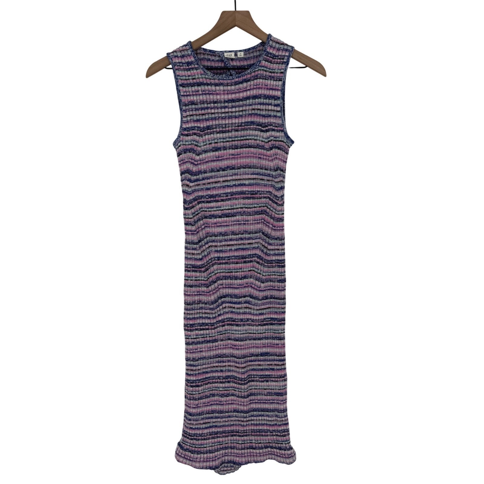 GAP ribbed knit midi dress in a multicolor stripe pattern. Sleeveless silhouette with a crew neckline and a keyhole detail at the back. The hemline features a subtle ruffle for added detail. Perfect for a casual day out or a relaxed vacation.