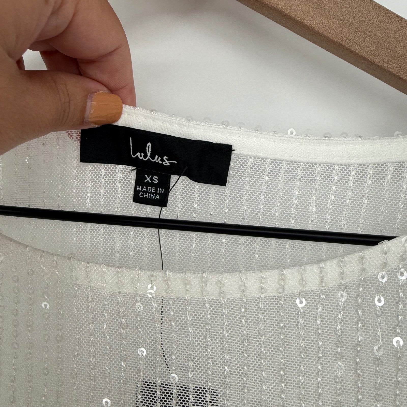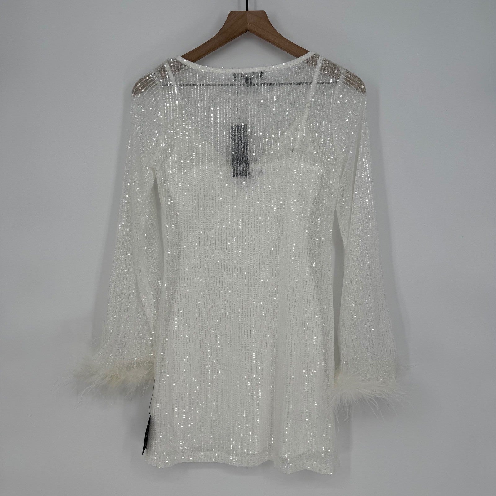 Keywords: Lulus dress, sequin dress, white sequin dress, feather cuff dress, long sleeve mini dress, party dress, cocktail dress, XS dress, new with tags dress, holiday dress, special occasion dress, sparkly dress, mini dress