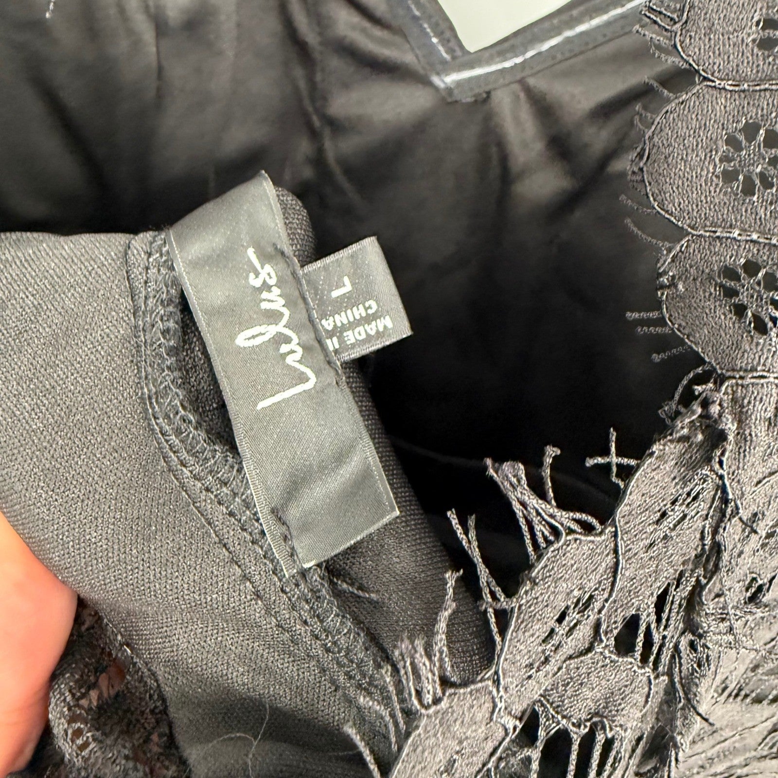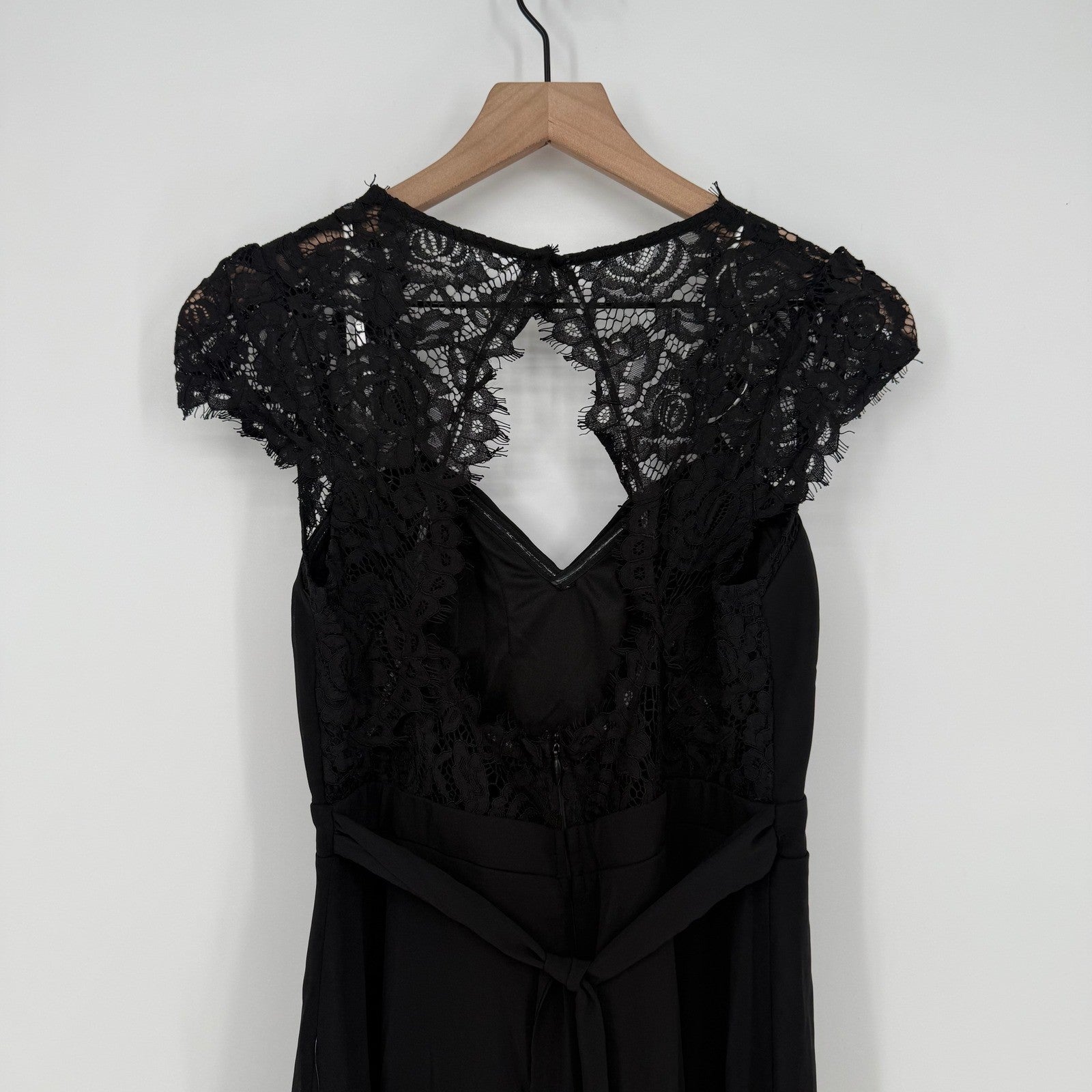Keywords: Lulus dress, black maxi dress, lace dress, formal gown, evening dress, party dress, sleeveless dress, wedding guest dress, bridesmaid dress, long black dress, size large dress, special occasion dress, cocktail dress, black tie dress