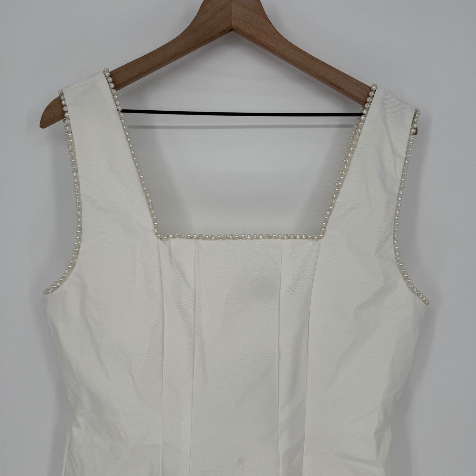 Chic and charming mini dress featuring a square neckline and a pearl-embellished trim. This elegant dress features a sleeveless design, a tailored bodice, and a flattering A-line silhouette. The clean lines and bright tone offer a modern minimalist aesthetic, making it versatile for various occasions. Perfect for a bridal shower, a garden party, or a sophisticated brunch outing.