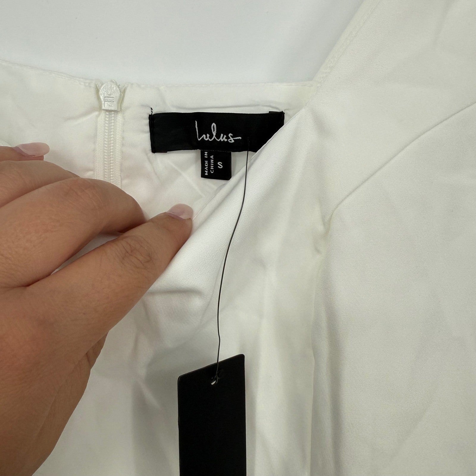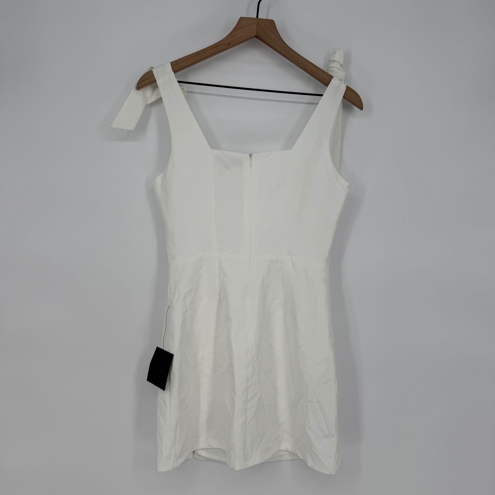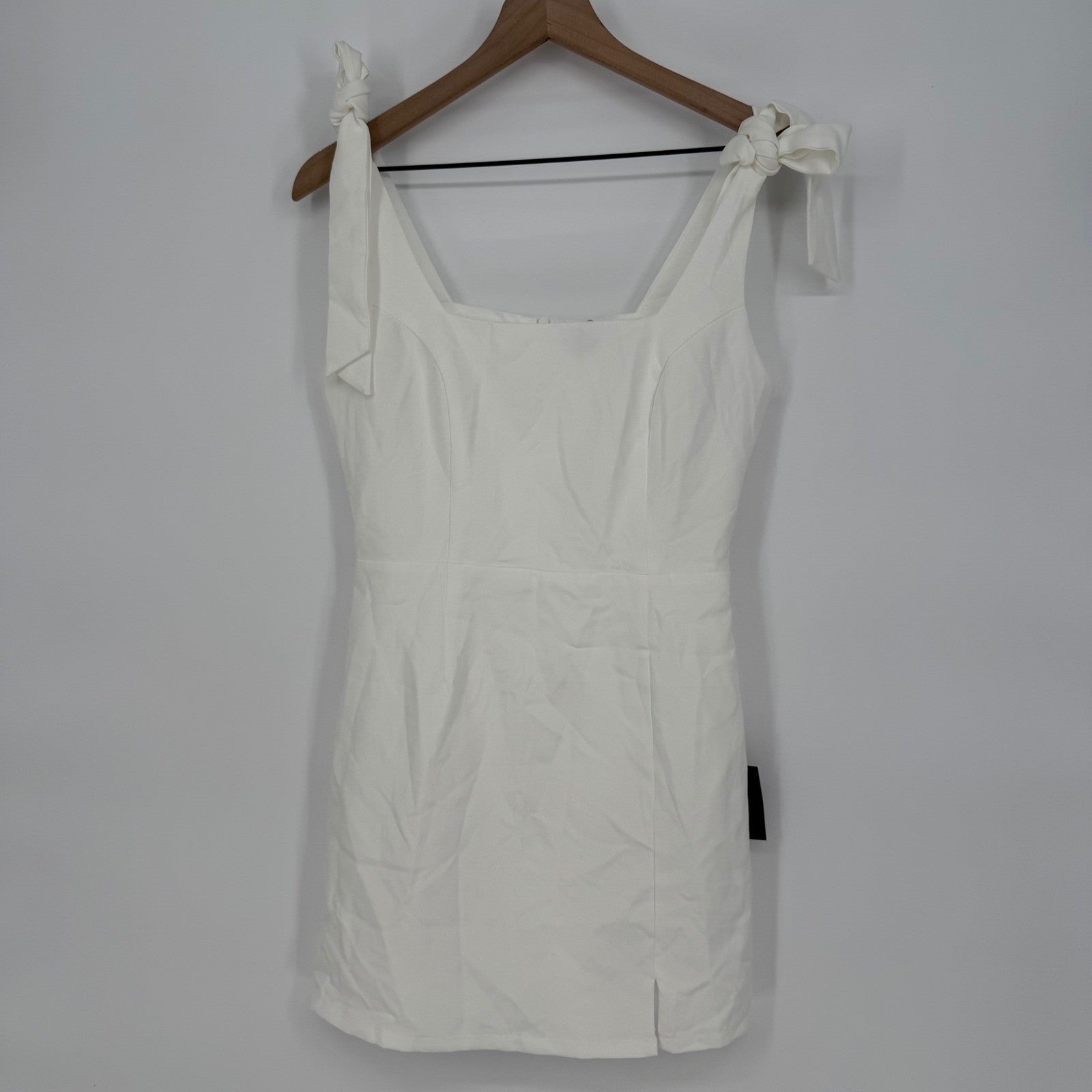 Keywords: Lulus dress, white mini dress, tie strap dress, square neck dress, sleeveless dress, party dress, cocktail dress, summer dress, bridal shower dress, casual dress, women's dress, size small, mini dress