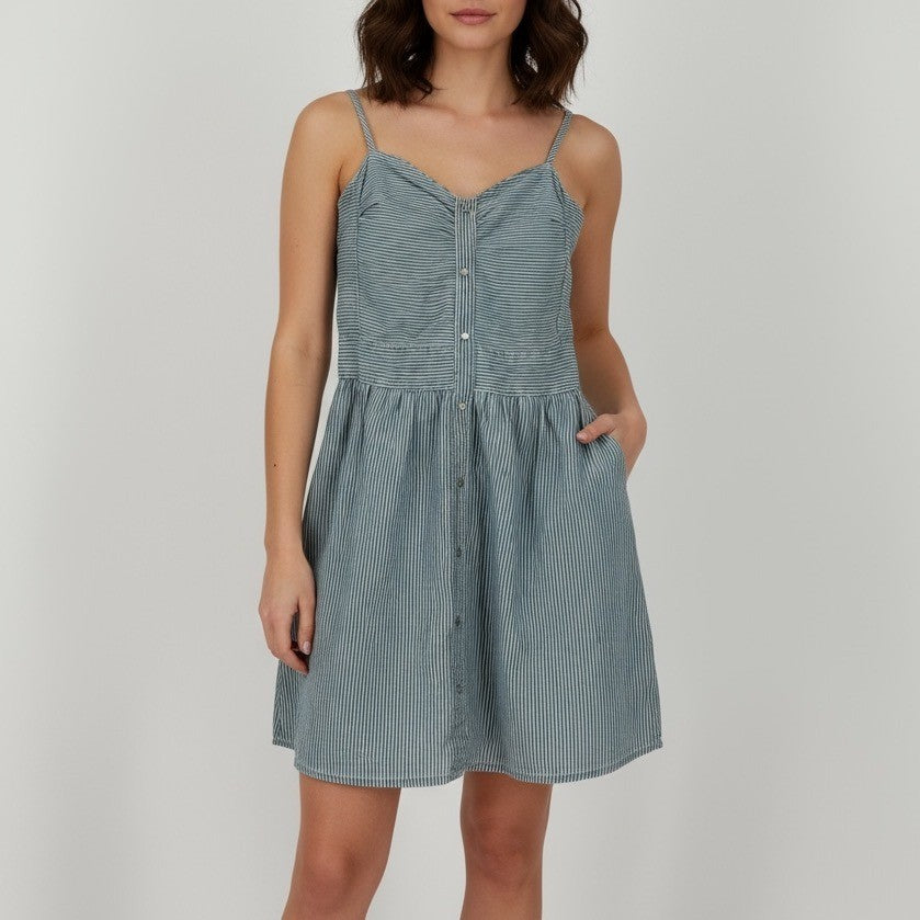 Keywords: sundress, pinstripe, button front, smocked back, spaghetti straps, summer dress, casual dress, beach dress, vacation dress, mini dress, shirred bodice, adjustable straps