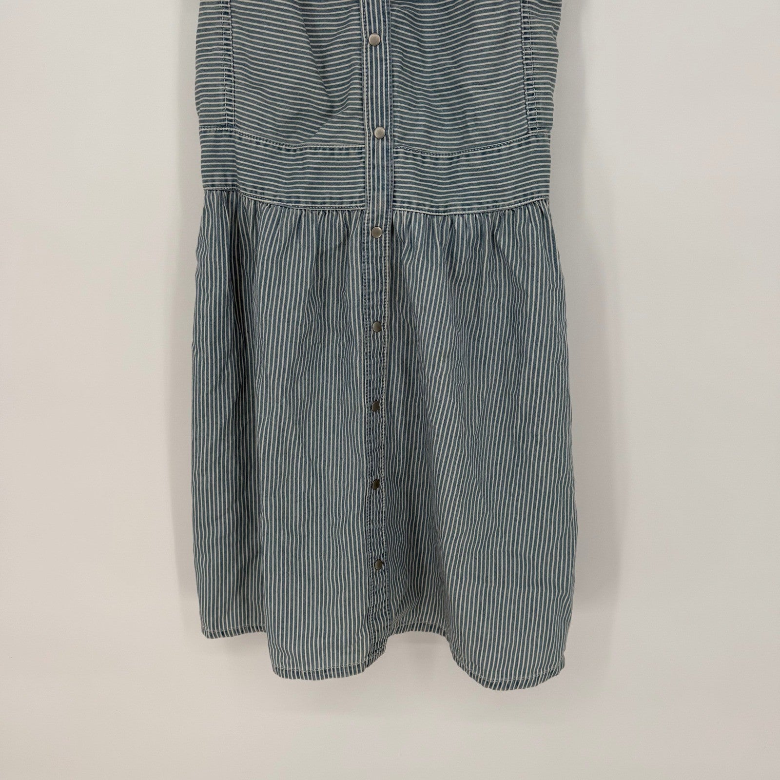 A casual sundress in a blue and white pinstripe pattern. Features a sweetheart neckline with button front detailing and adjustable spaghetti straps. The bodice is shirred and smocked in the back for a comfortable and flattering fit, while the skirt is gently gathered. Perfect for a picnic, a beach vacation, or a casual day out.