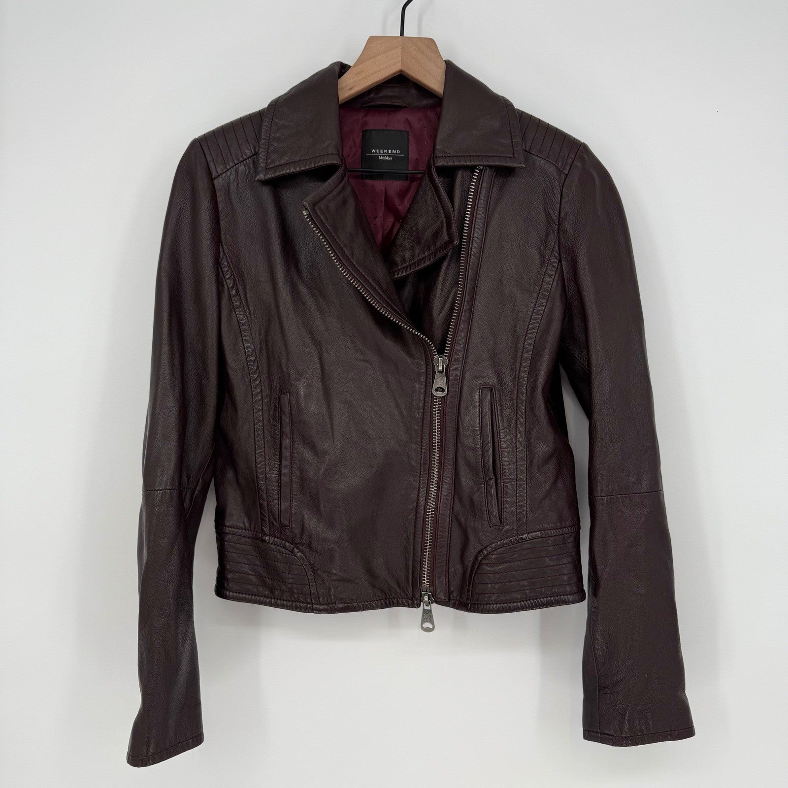 A rich burgundy leather moto jacket from Weekend Max Mara. This stylish jacket features an asymmetrical zipper closure, a classic notched lapel, and ribbed detailing on the shoulders and waist for a textured, edgy appeal. The interior lining is a deep maroon satin with a subtle dot pattern. Perfect for adding a touch of sophistication and edge to your everyday look or for a night out.