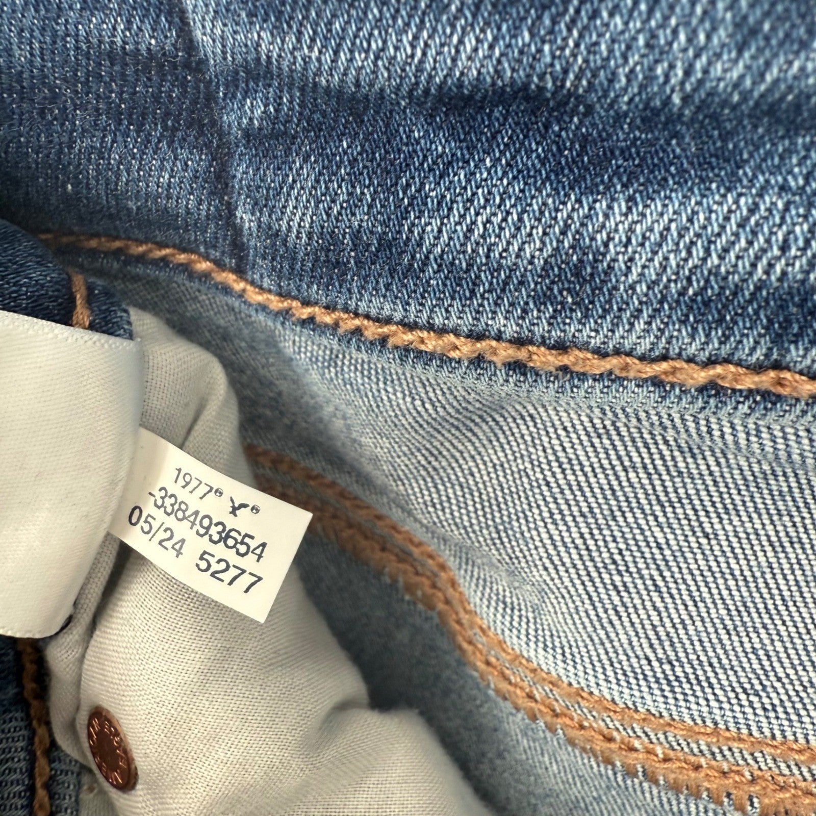 American Eagle Outfitters flared jeans. These stylish jeans feature a medium wash blue denim with strategic distressing and rips on the knees and a frayed hem. The "Next Level Stretch" fabric offers comfort and a flattering fit. Perfect for a casual day out, concerts, or a trendy evening look.