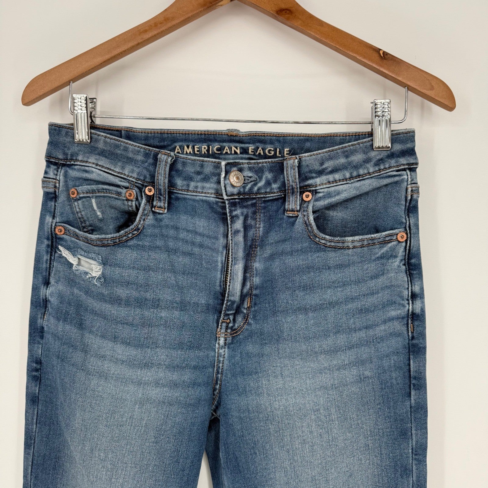 Keywords: American Eagle Jeans, Womens Jeans, Flare Jeans, Distressed Jeans, Ripped Jeans, High Rise Jeans, Blue Denim, Size 4 Jeans, Next Level Stretch, Frayed Hem Jeans, Casual Jeans, Trendy Jeans, Fashion Jeans, American Eagle Outfitters, Comfortable Jeans