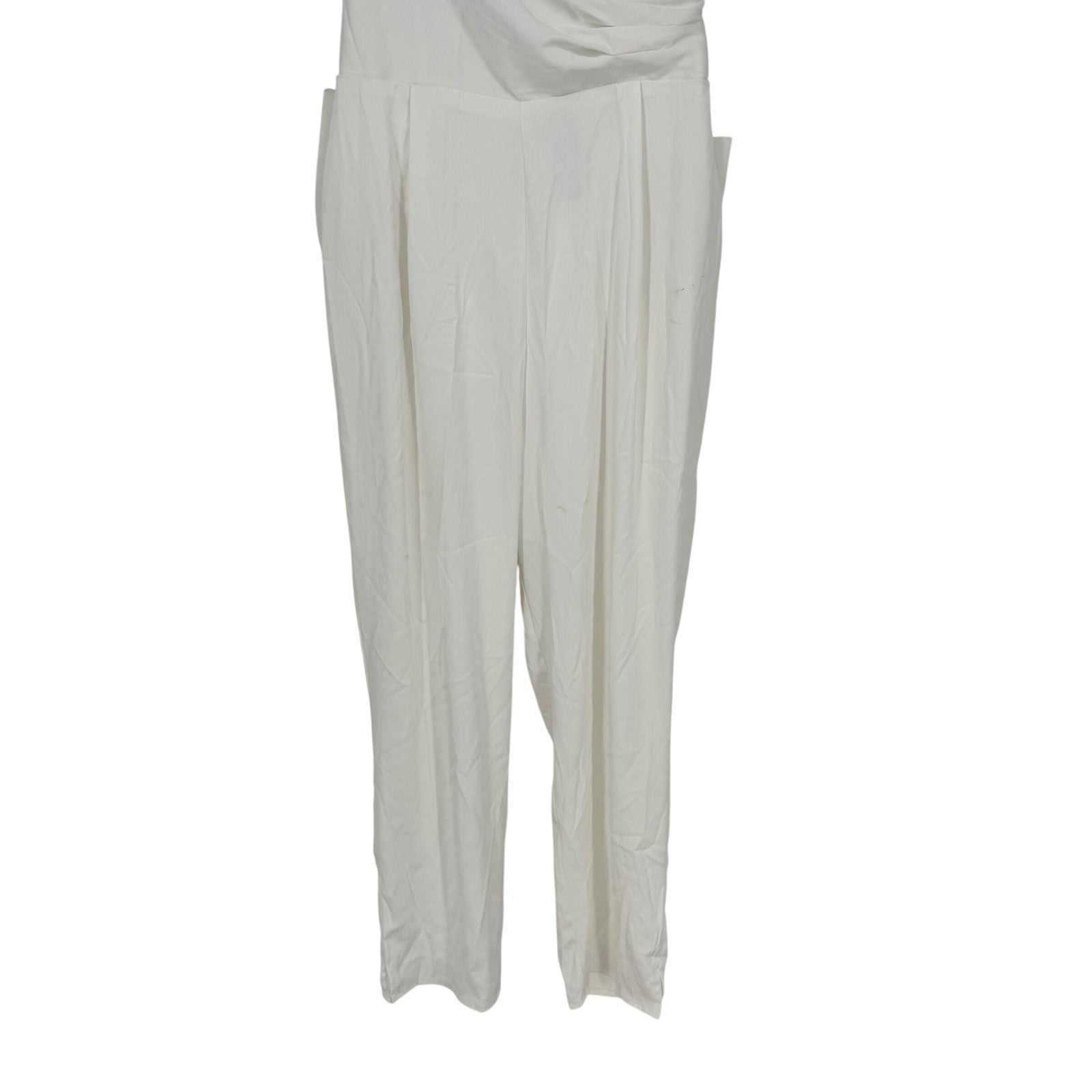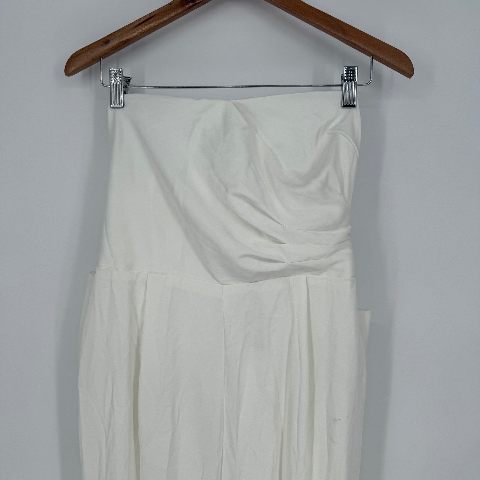 Keywords: white jumpsuit, strapless jumpsuit, bow back jumpsuit, wide leg jumpsuit, formal jumpsuit, wedding guest jumpsuit, party jumpsuit, women's jumpsuit, size L jumpsuit, white romper, evening jumpsuit, cocktail jumpsuit