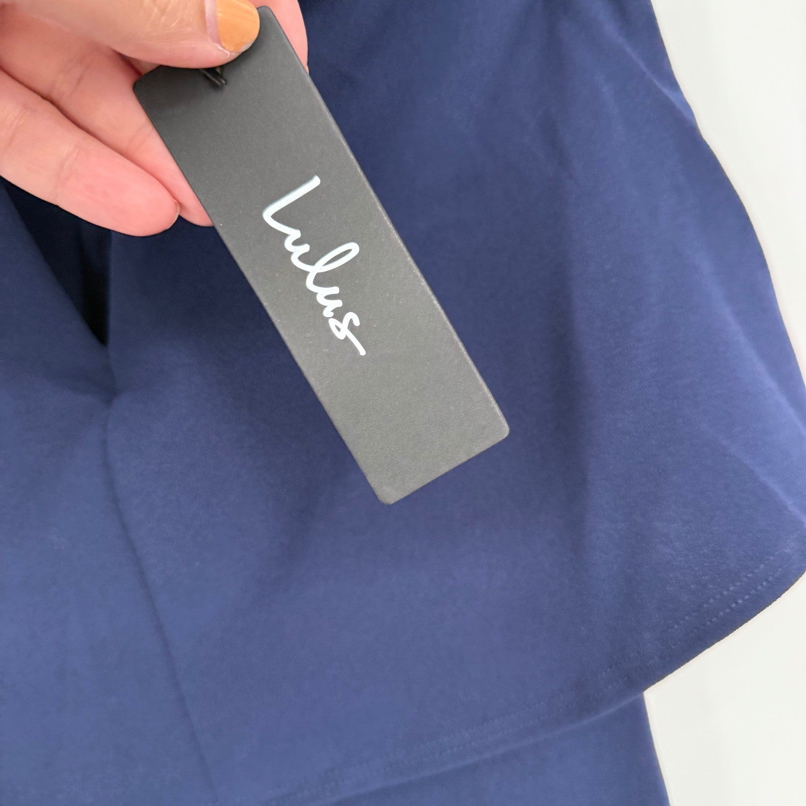 Keywords: Lulus, Strapless jumpsuit, Navy blue jumpsuit, Wide leg jumpsuit, Occasion jumpsuit, Party jumpsuit, Evening jumpsuit, Elegant jumpsuit, Special occasion, XS jumpsuit, Women's jumpsuit, New with tags, Dark blue, Slit legs, Overlay top