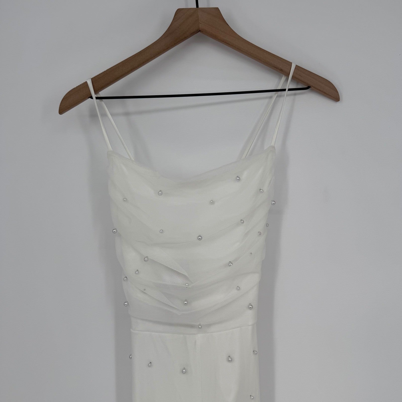 Keywords: Lulus, White Jumpsuit, Pearl Embellished, Spaghetti Strap, Ruched Bodice, Bridal Jumpsuit, Wedding Outfit, Special Occasion, Evening Jumpsuit, Party Jumpsuit, Lace Up Back, Formal Jumpsuit, Wide Leg Jumpsuit, Elegant Jumpsuit