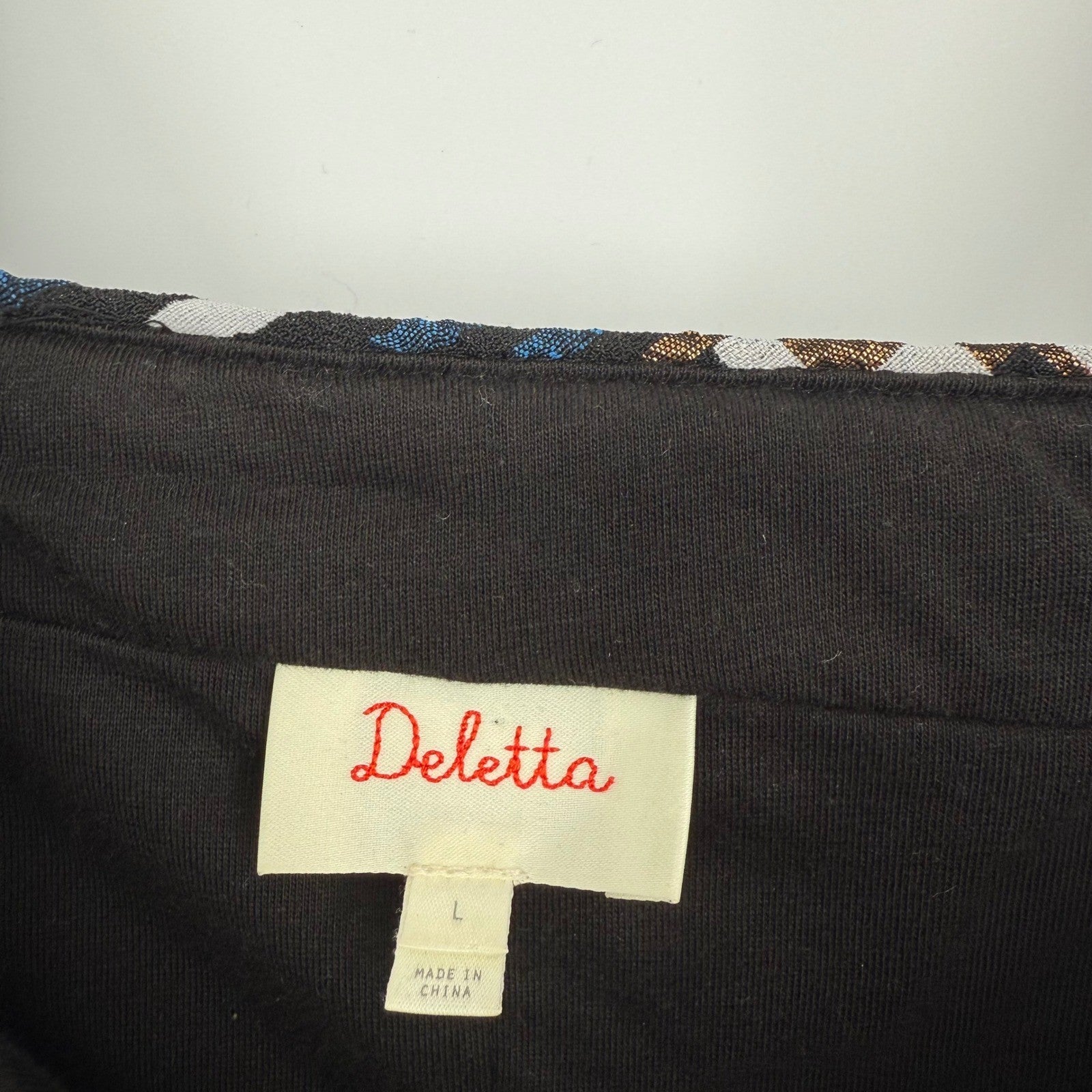 Keywords: Deletta top, black velvet top, peplum top, pleated top, striped top, plaid top, sleeveless top, party top, womens top, size L top, evening top, dressy top, unique top, statement top