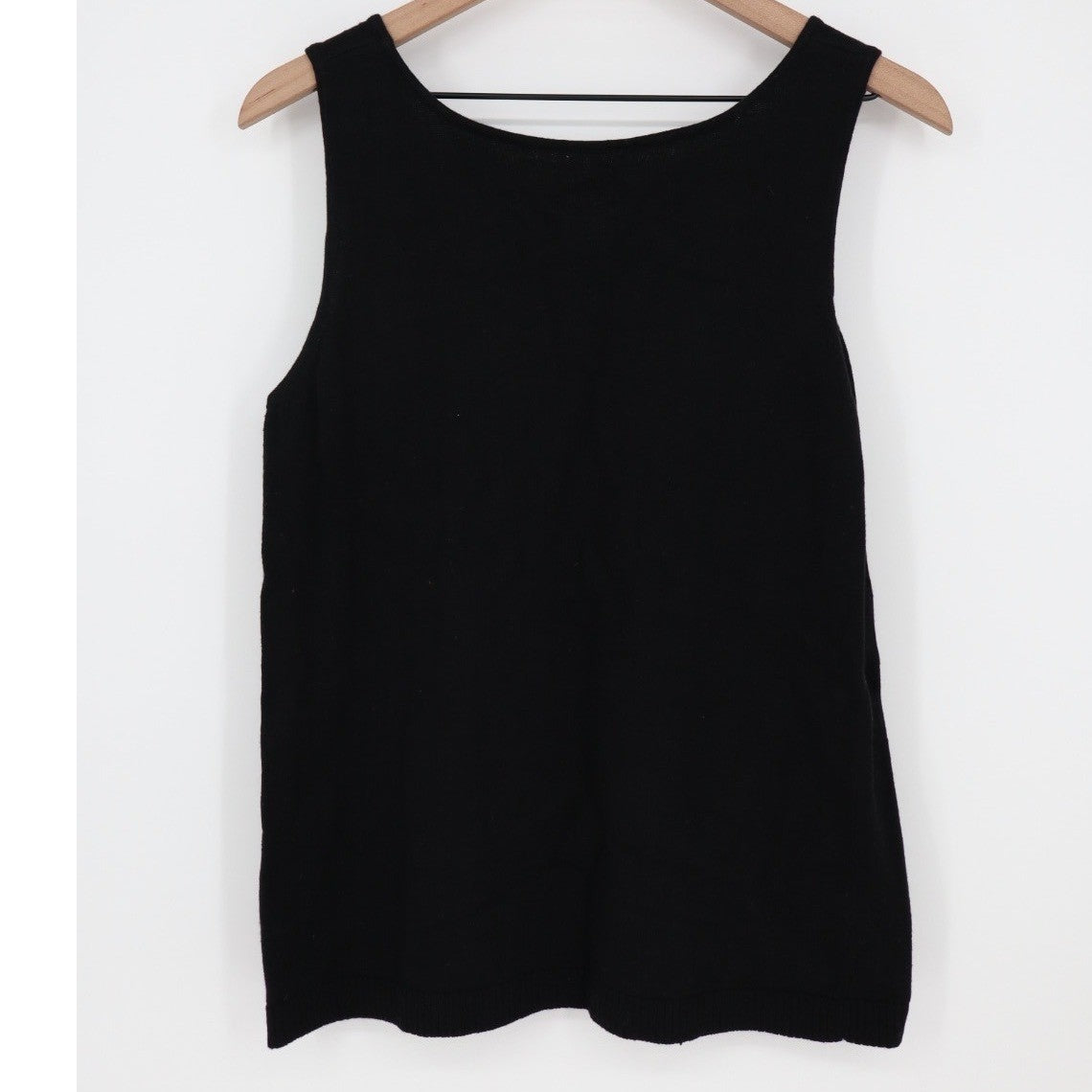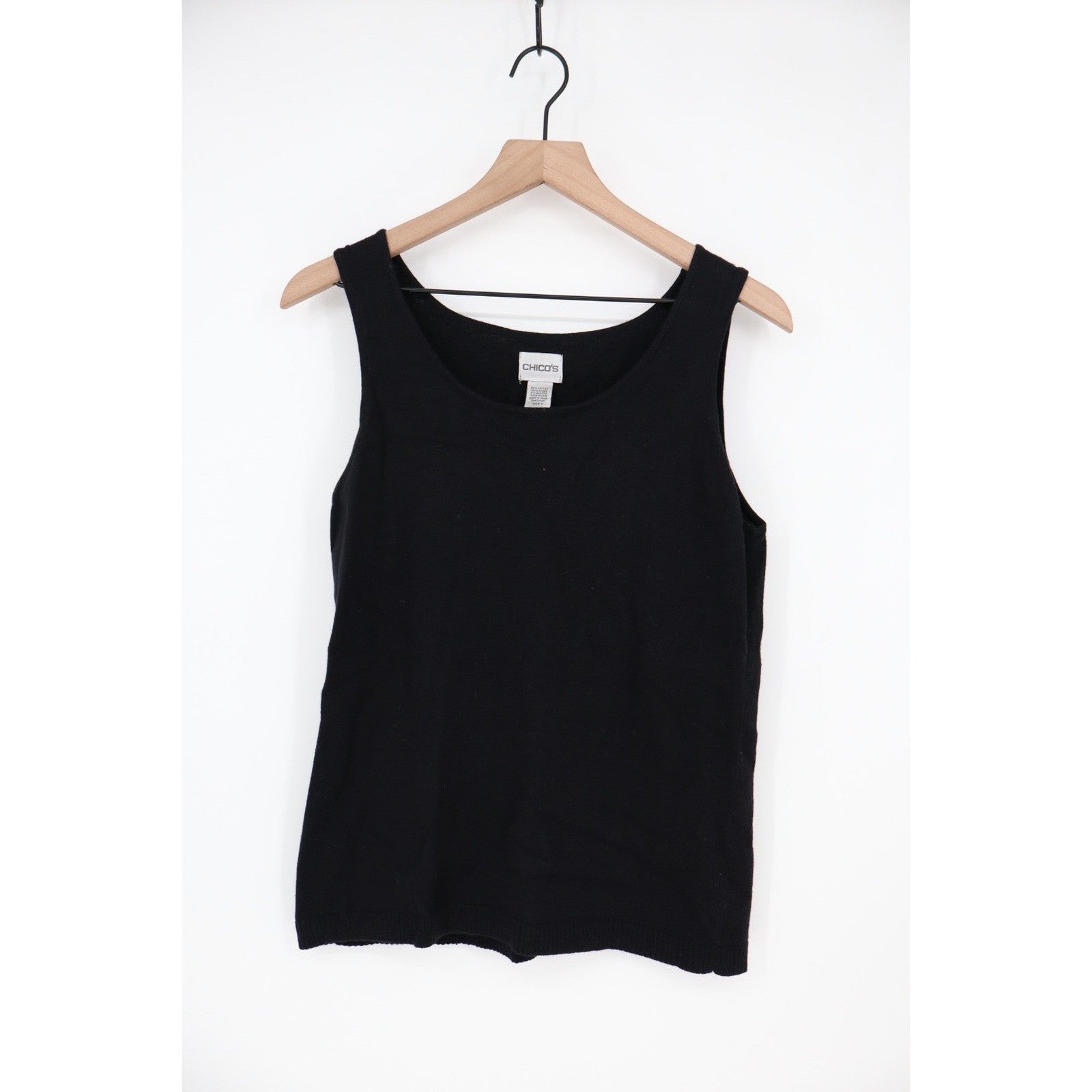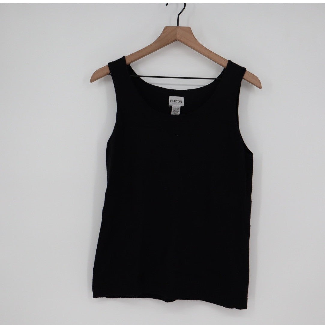 Keywords: Chico's, knit tank, sleeveless top, scoop neck, sweater vest, basic, layering piece, wardrobe staple, casual wear, office attire, travel essential, knitwear, simple, solid black