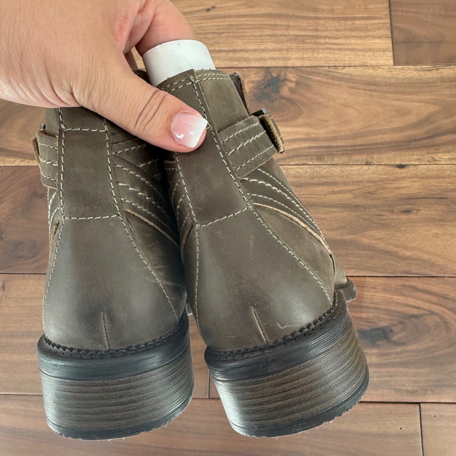 Stylish and versatile ankle boots, perfect for adding a touch of rugged charm to any outfit. These brown leather booties feature a classic silhouette with a comfortable low heel and a convenient side zipper for easy on and off. The decorative buckle strap adds a touch of visual interest, while the contrast stitching provides a subtle yet stylish detail. These boots are ideal for everyday wear, casual outings, or adding an edgy touch to a more dressed-up look. Pair them with jeans and a sweater for a relaxed weekend vibe, or dress them up with a skirt and tights for a night out.
