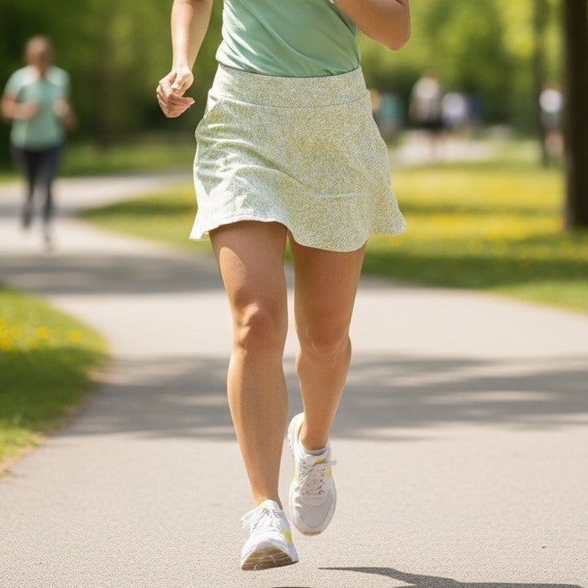 Chic and functional golf skirt with playful flair. This skirt features a unique printed design in shades of white, green, and yellow, adding a touch of personality to your athletic wear. It's designed with a frill hem for a stylish touch, while the built-in undershorts ensure comfort and coverage during your game. Perfect for a day on the green, a casual tennis match, or even a stylish athleisure look for running errands.