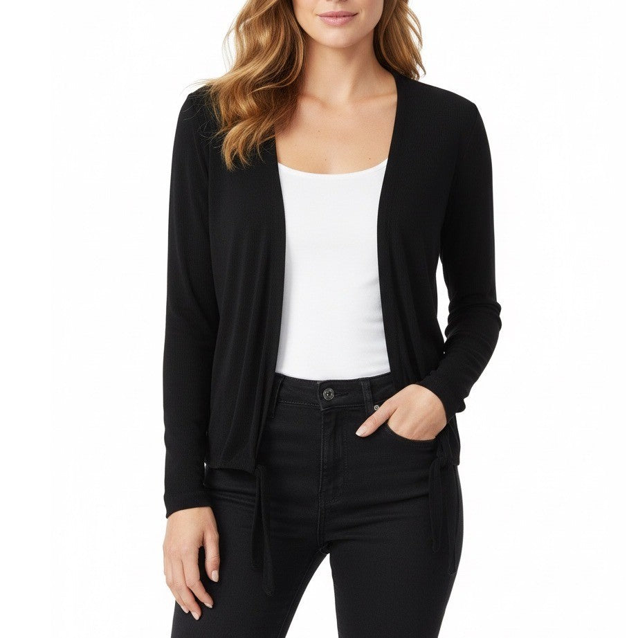 Chicos Travelers black open front cardigan sweater. This versatile layering piece features long sleeves and a unique tie-hem detail that adds a touch of flair. Perfect for dressing up a casual outfit or adding an extra layer of warmth and style. Ideal for everyday wear, travel, or a relaxed evening out.