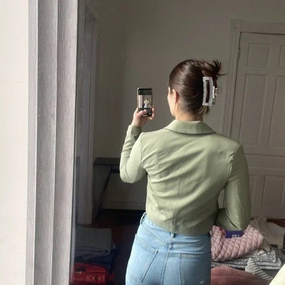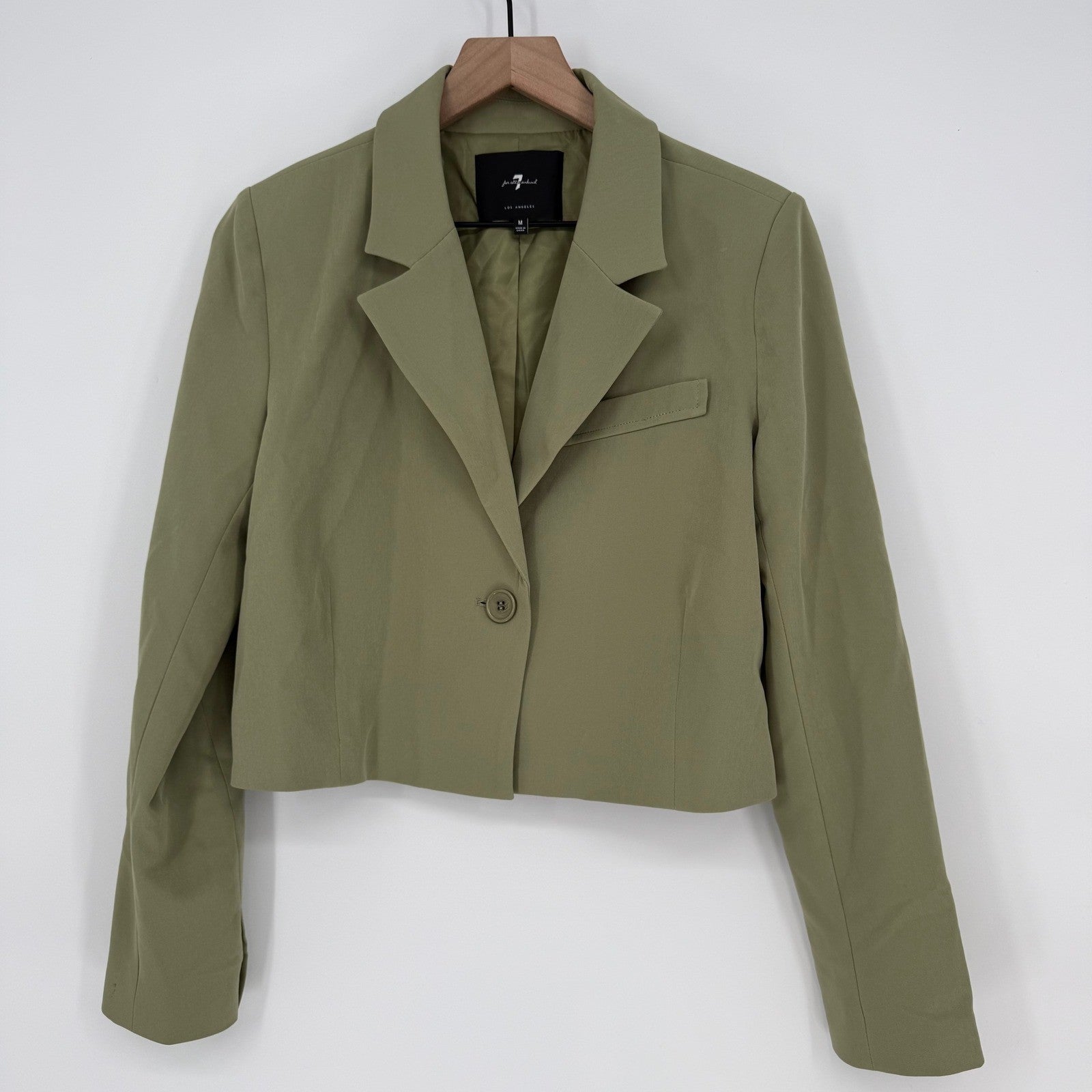 Keywords: 7 For All Mankind, cropped blazer, olive green blazer, cropped jacket, single button blazer, career blazer, casual blazer, modern blazer, size M, womens blazer, office wear, business casual, cropped jacket M, green jacket, stylish blazer