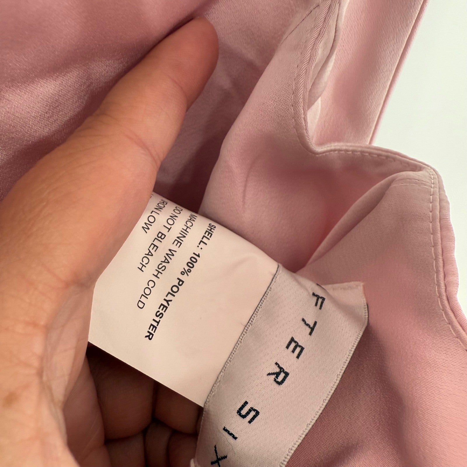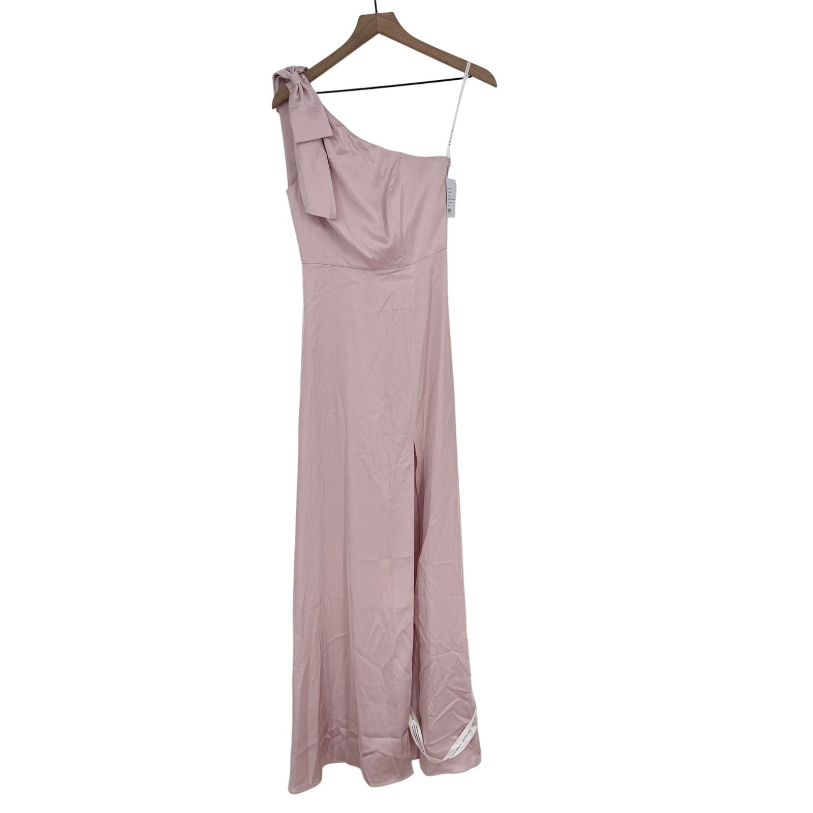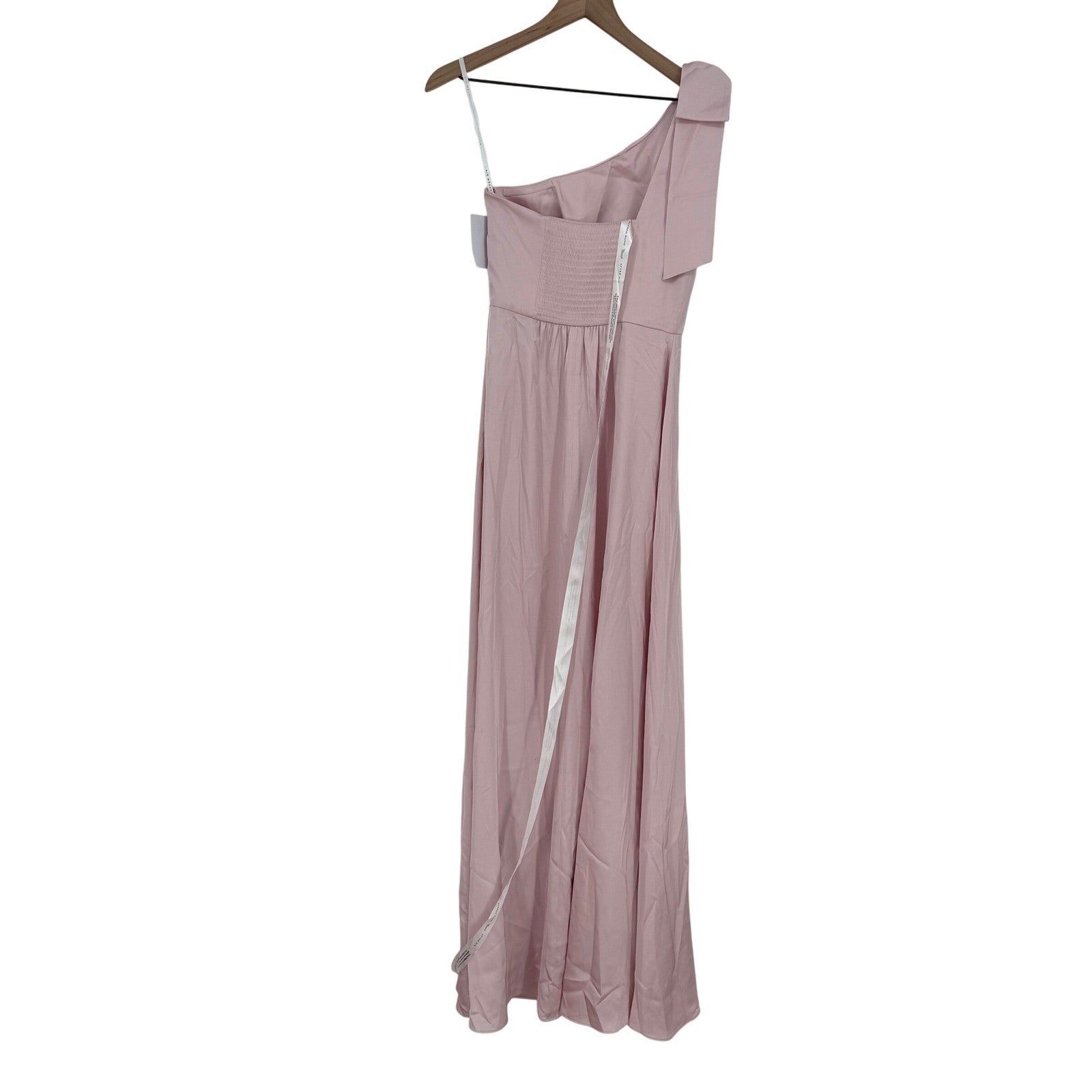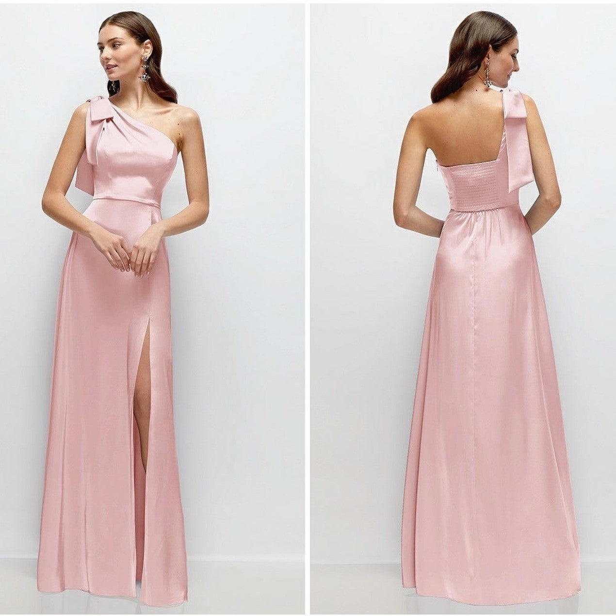Keywords: one shoulder dress, maxi dress, formal dress, wedding guest dress, bridesmaid dress, pink dress, satin dress, bow detail dress, slit dress, evening gown, special occasion dress, after six dress, petite dress, xs dress, ballet pink dress