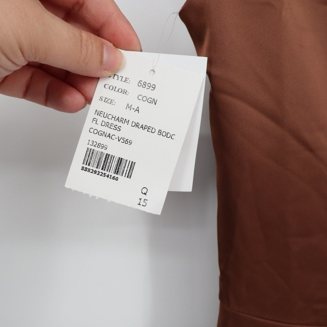 After Six Style 6899 maxi dress in a rich cognac hue. This sleeveless gown features a striking draped bodice with asymmetrical ruching across the front, leading to a fitted waist. The skirt flows gracefully to the floor, creating an elegant silhouette. Perfect for formal events, weddings, or a sophisticated evening out.