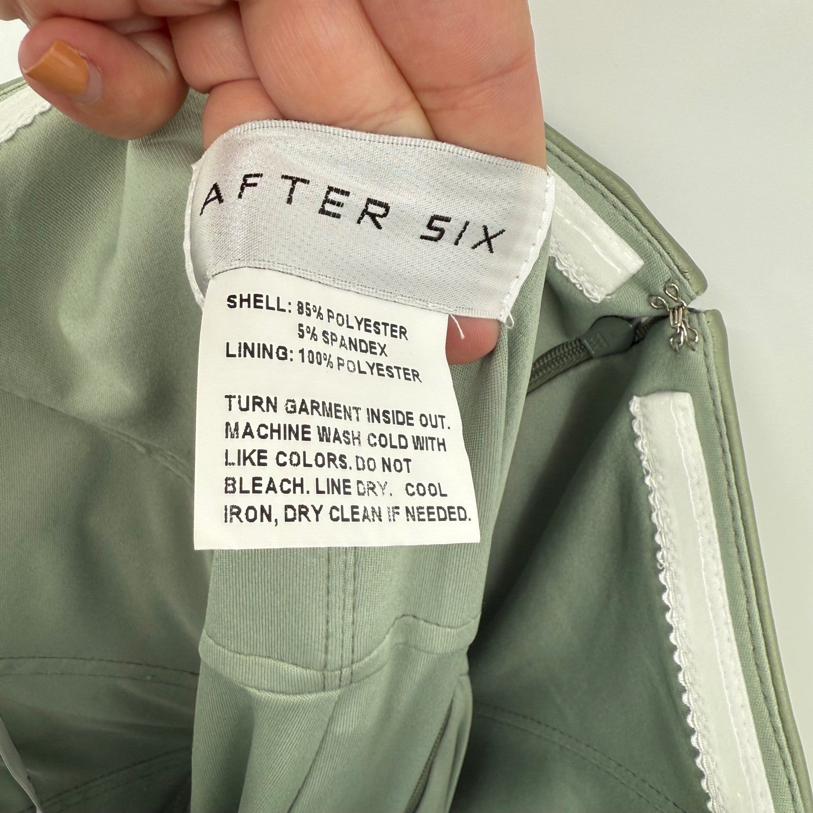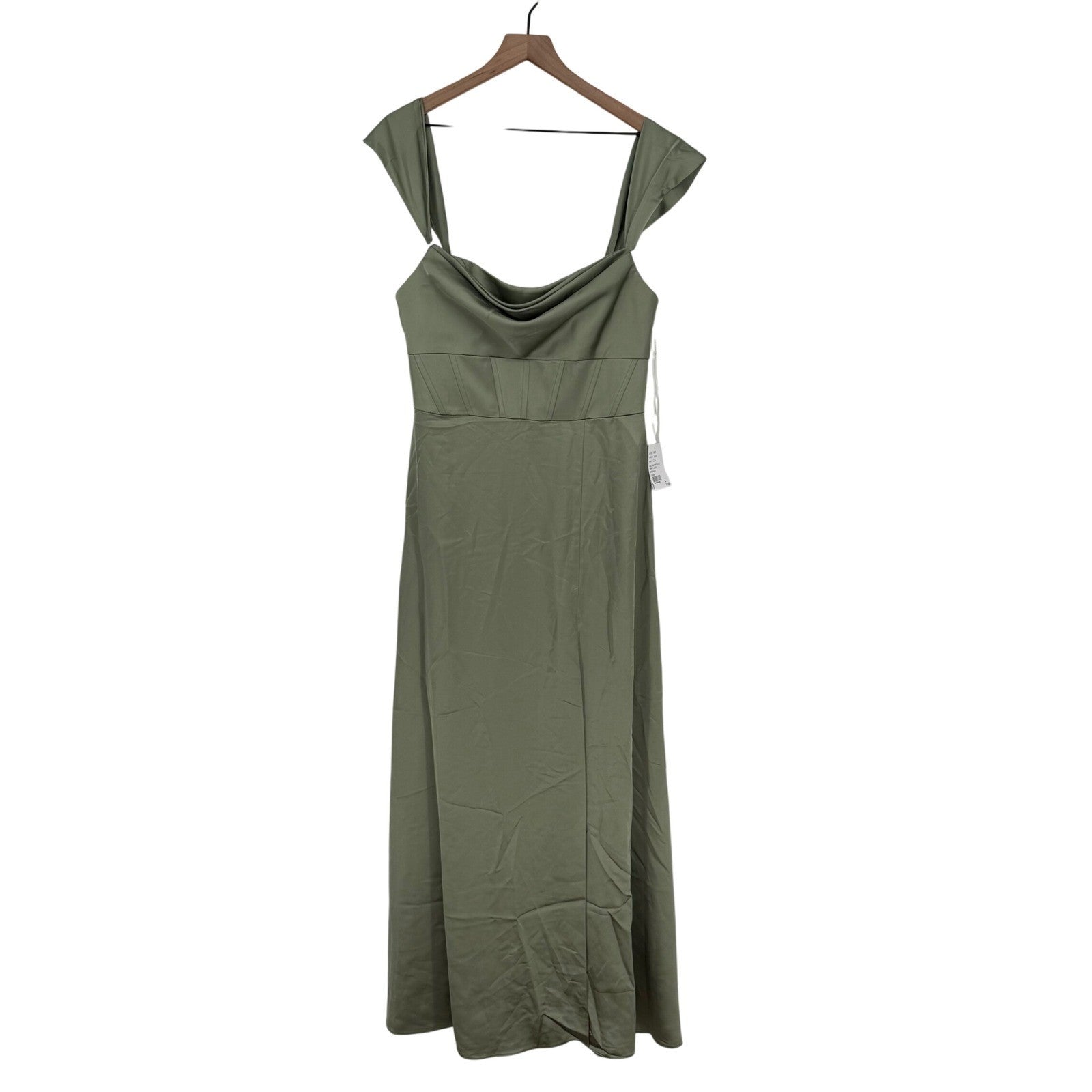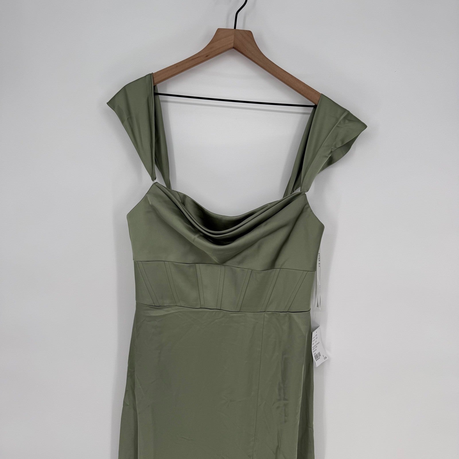 Keywords: After Six Dress, Sage Green Dress, Satin Maxi Dress, Corset Dress, Drape Neck Dress, Off Shoulder Dress, Formal Gown, Evening Dress, Wedding Guest Dress, Prom Dress, Bridesmaid Dress, Size 12 Dress, Flounce Sleeve Dress, Elegant Dress, Party Dress