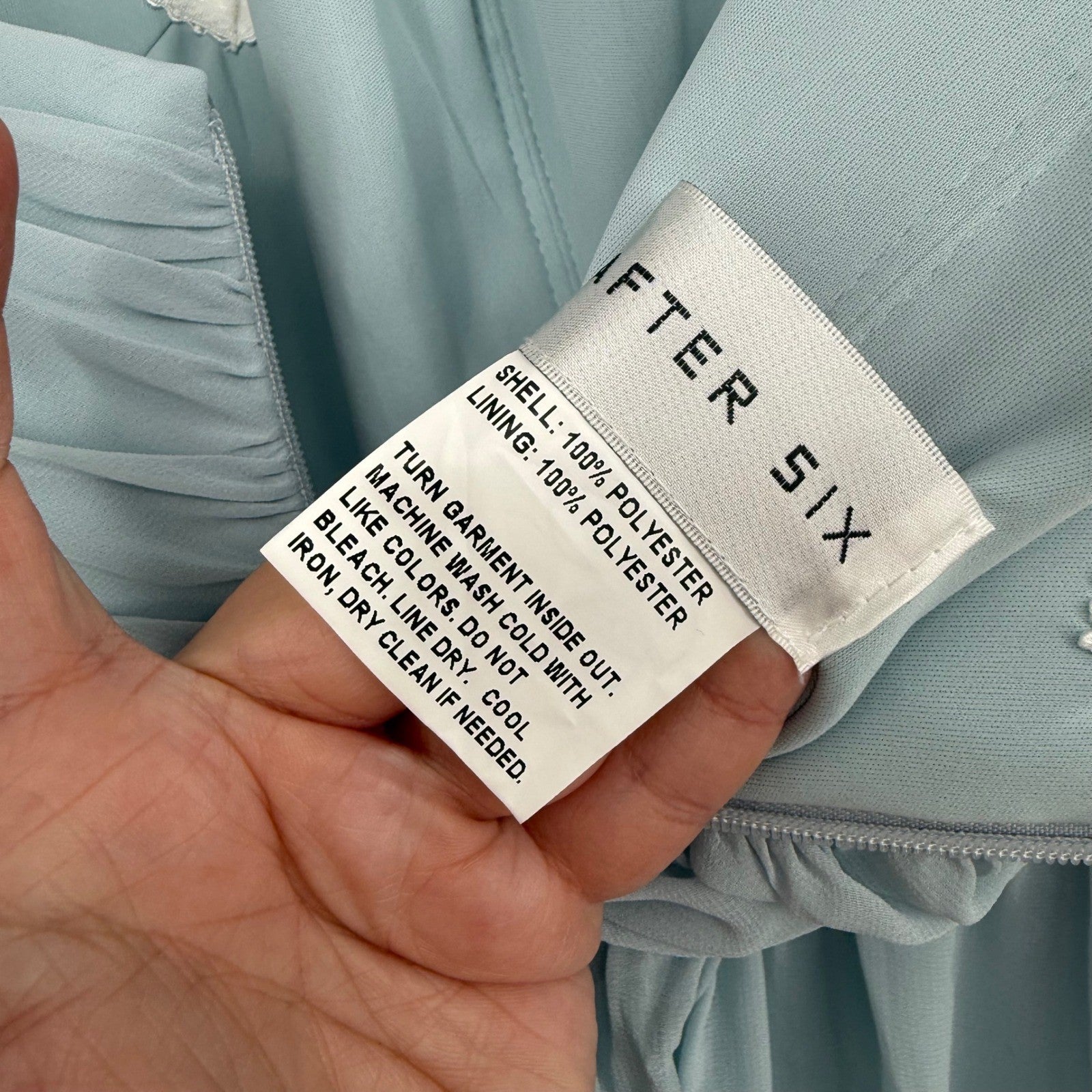 Keywords: After Six dress, strapless gown, chiffon formal dress, bridesmaid dress, ruched bodice, flowy dress, long evening gown, special occasion dress, formal wear, party dress, elegant dress, sweetheart neckline, size 10, mist color dress, new with tags
