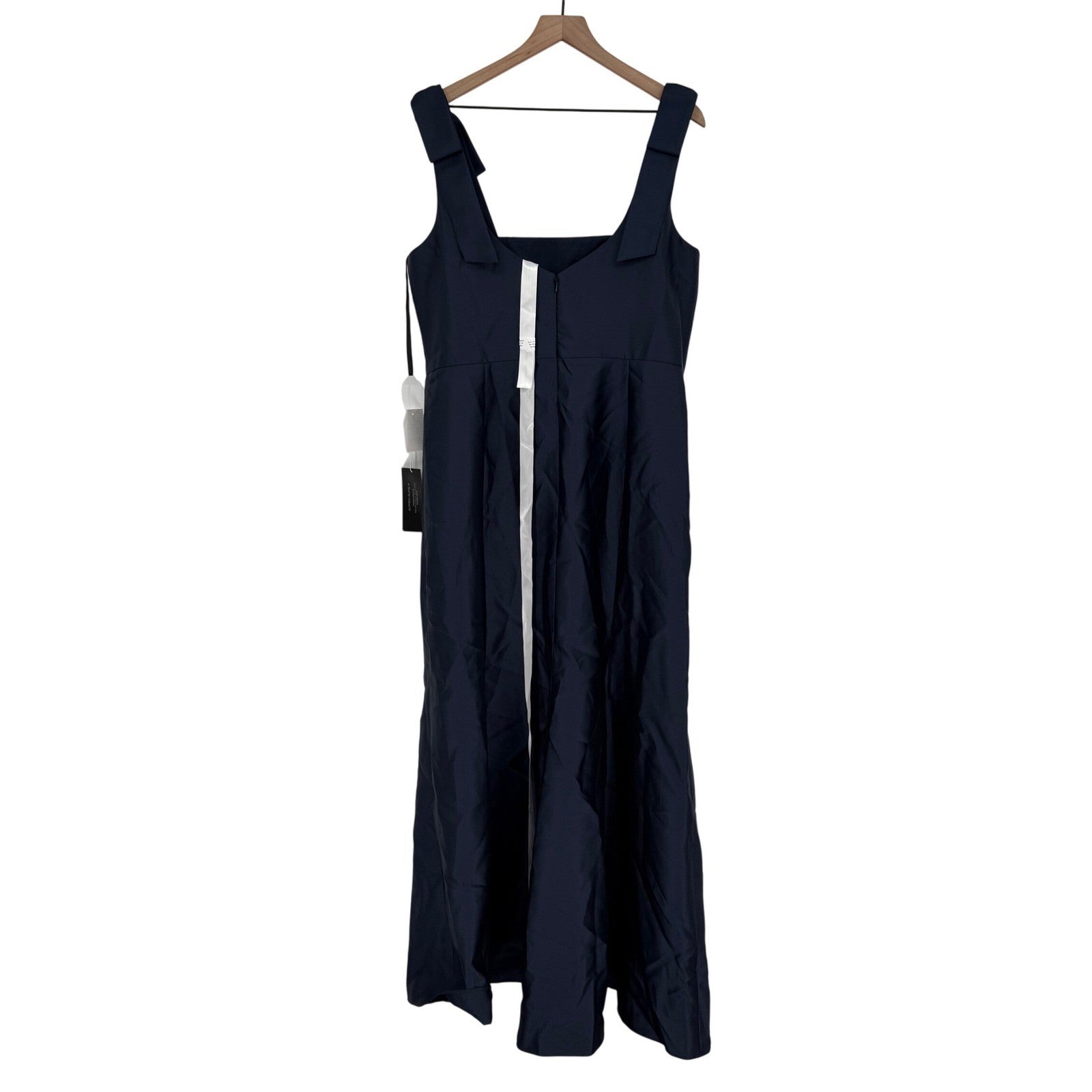 Alfred Sung navy square neck maxi dress with chic bow shoulder details. This elegant gown features a flattering silhouette and a sophisticated midi length, perfect for making a statement. Its timeless design and refined style make it ideal for formal events, galas, or sophisticated evening affairs.