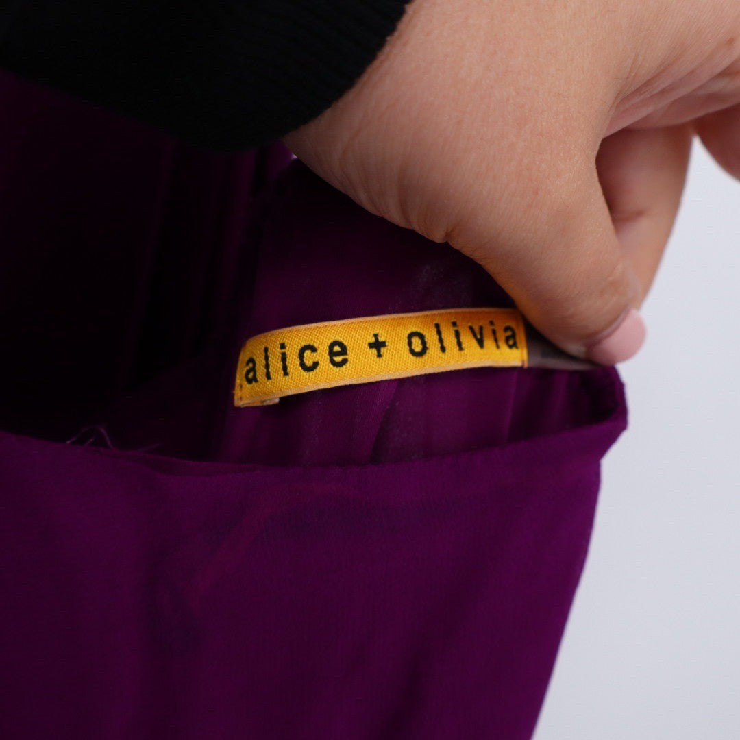 Alice + Olivia purple silk blend strappy mini dress. Adjustable spaghetti straps and a flattering elasticized waist define this chic piece. The flowy skirt adds a touch of effortless movement. Perfect for a summer brunch or a night out.