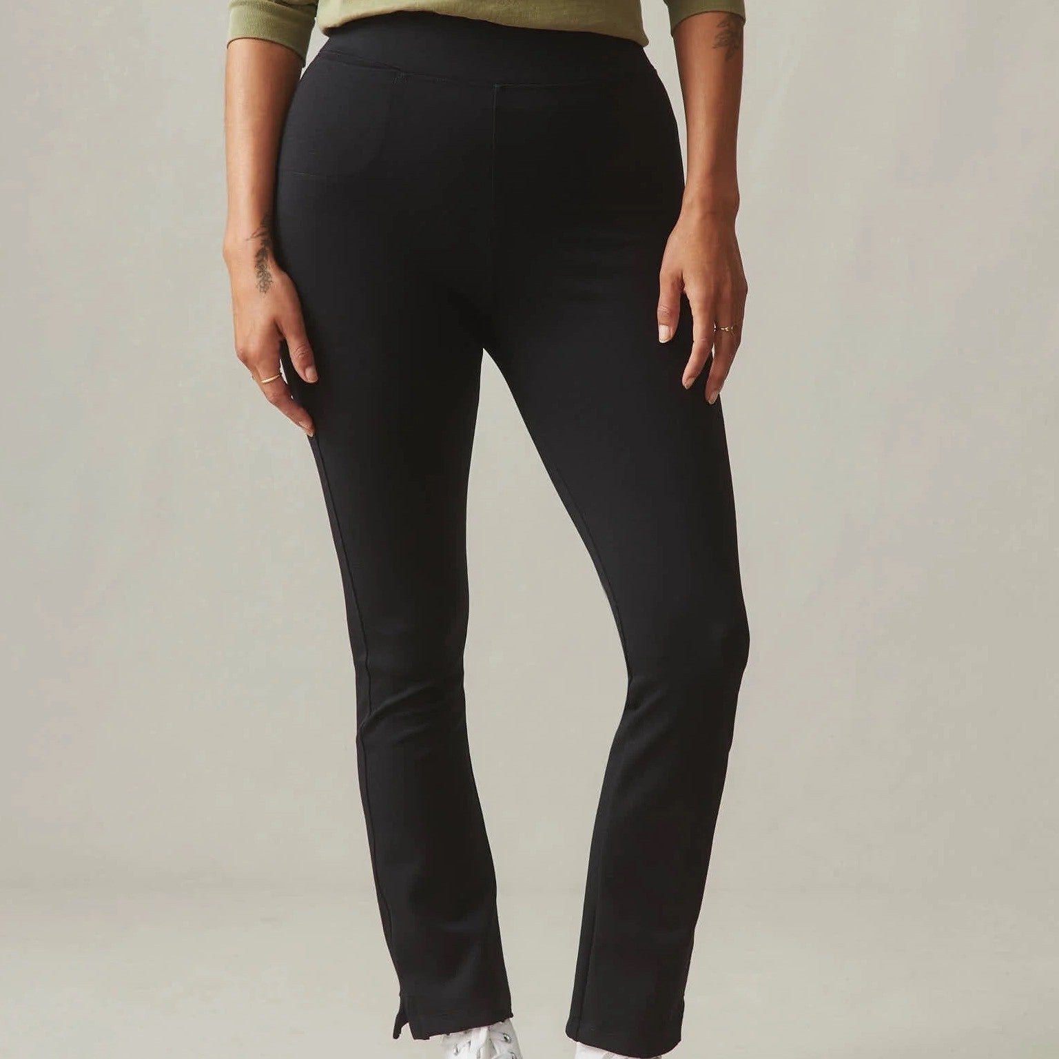 American Giant black bootcut leggings pants. These comfortable pants feature a flattering fit and a versatile bootcut silhouette. Two front pockets offer practicality and style. Perfect for casual outings, running errands, or lounging at home.