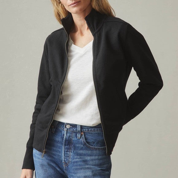 A classic black full-zip mock neck sweatshirt jacket. This versatile outerwear piece is crafted from 100% cotton for comfortable wear. It features a full zip front closure, a mock neckline, and two front pockets for convenient storage. The minimalist design with subtle shoulder detailing makes it a stylish choice for casual outings or layering during cooler weather. Perfect for everyday wear, weekend adventures, or travel.