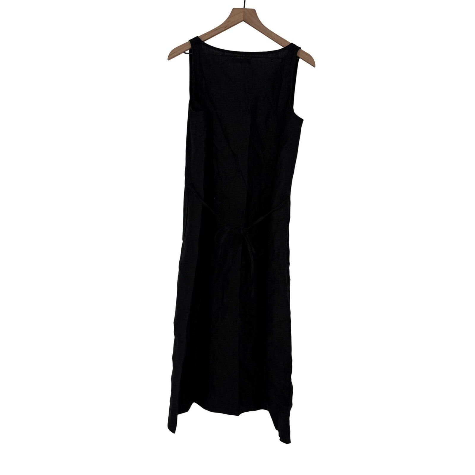 Black linen sleeveless midi dress. This dress features a flattering V-neckline and a tie belt for adjustable waist definition. Its simple yet elegant silhouette makes it a versatile piece for everyday wear or a casual outing.