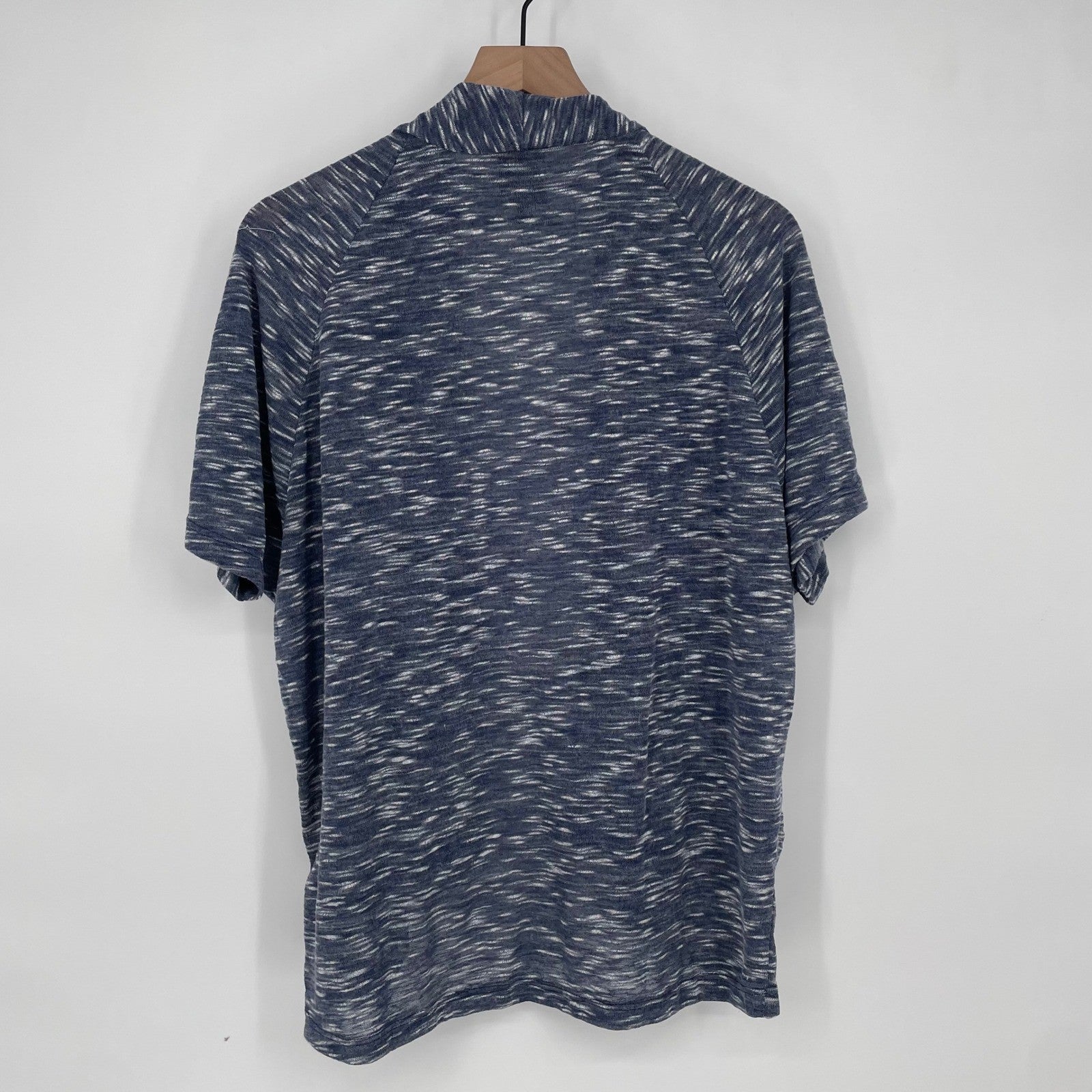 A marled open front cardigan sweater. This stylish piece features a flattering draped neckline and comfortable short sleeves, perfect for layering. Its unique marled pattern in shades of blue and white adds a touch of texture and visual interest. Ideal for casual outings, relaxed office days, or evening strolls.