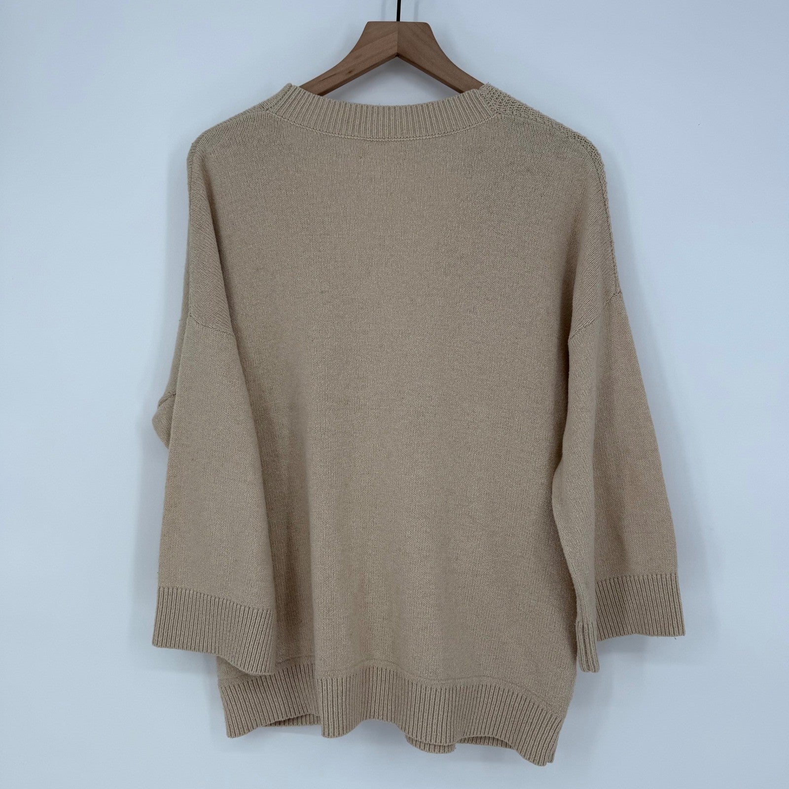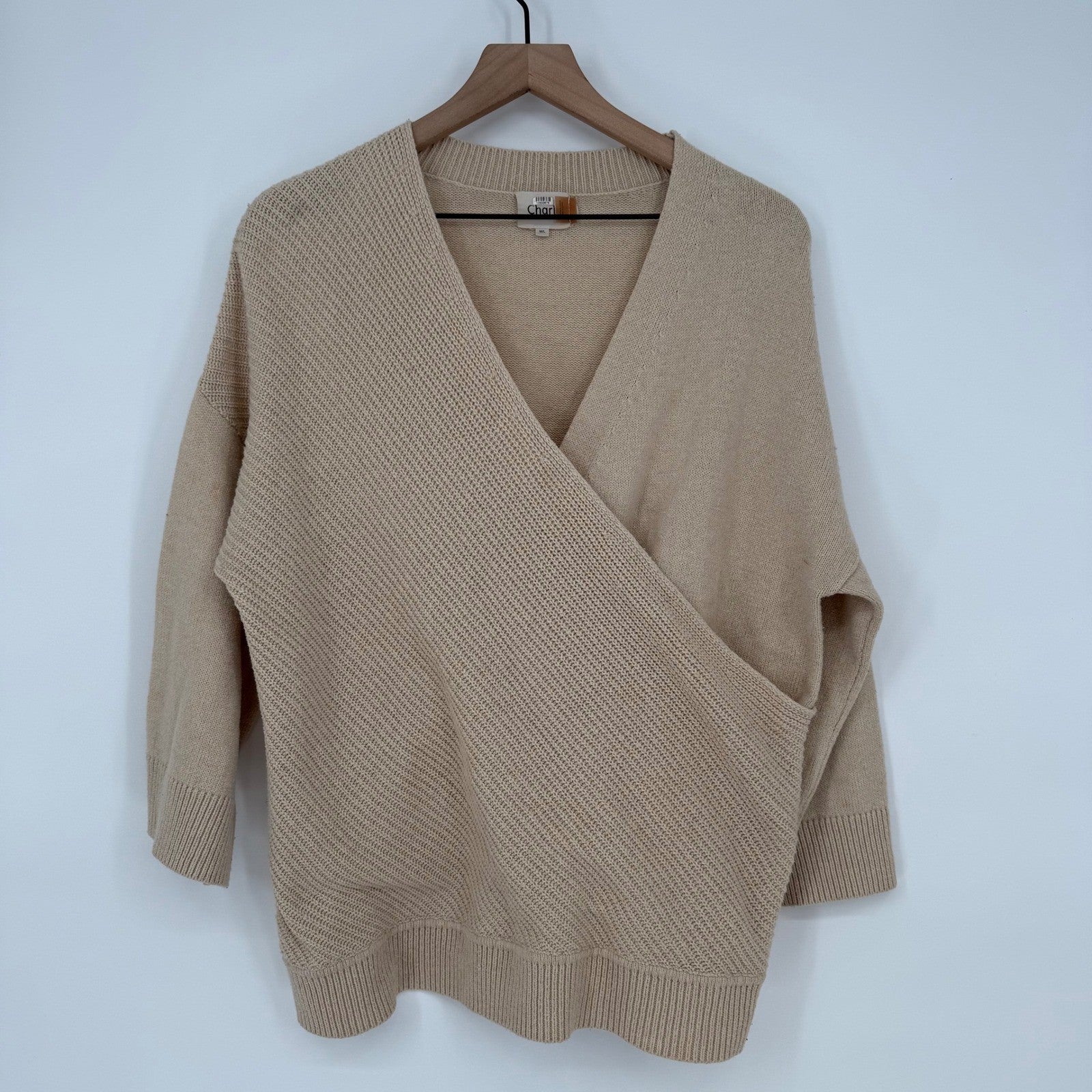 Keywords: Charli, Knit Sweater, Wrap Sweater, Beige Sweater, Wool Blend, Oversized Sweater, Casual Sweater, Pullover Top, V-Neck Sweater, 3/4 Sleeve Sweater, Ribbed Sweater, M/L Sweater, Comfortable Sweater, Cozy Sweater