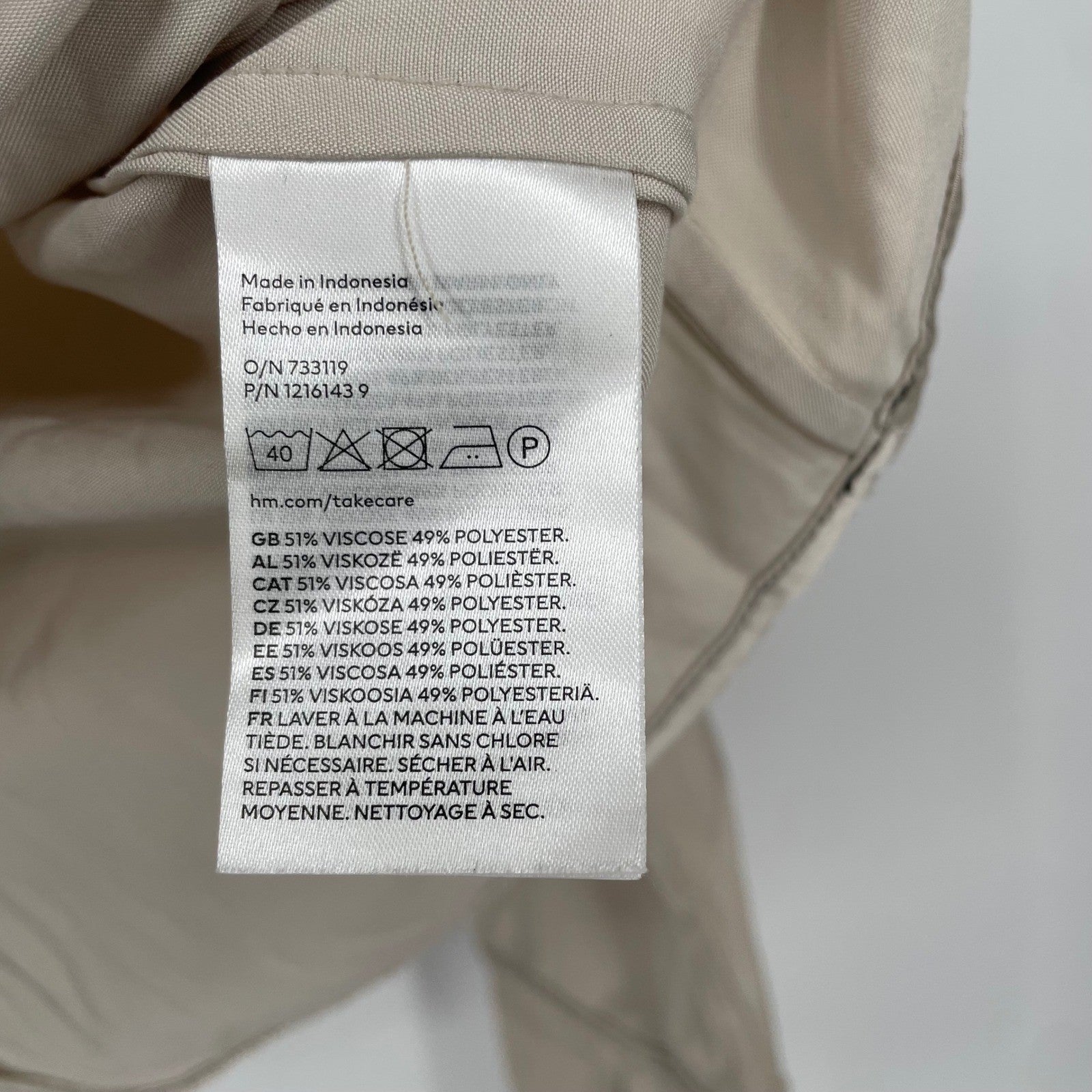 H M beige satin long sleeve blouse. This chic top showcases a sleek silhouette with elegant button cuffs on its long sleeves. The lustrous satin fabric drapes beautifully, offering a sophisticated look. Perfect for a night out or a stylish office ensemble.