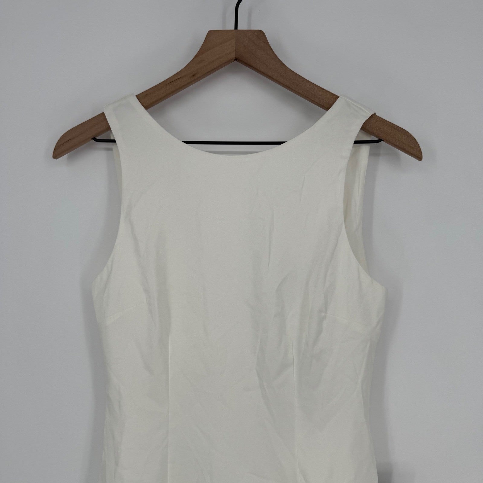 Elegant mini dress in a versatile white hue. This sleeveless dress features a flattering V-neck and a low scoop back, perfect for showcasing your shoulders. It's fully lined for comfort and has a concealed back zipper. The fitted silhouette gently hugs your curves, falling to a modest mini length. Style this dress for a casual day out, a summer party, or a bridal event.