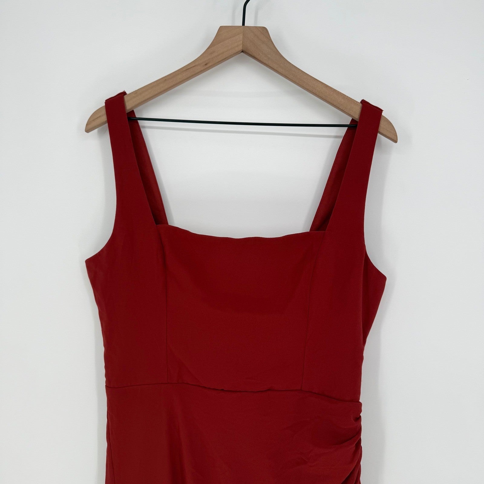 Keywords: Lulus dress, rust red dress, midi dress, bodycon dress, sleeveless dress, party dress, cocktail dress, ruched dress, square neck dress, evening dress, occasion dress, Lulus, size L, red dress, tank dress