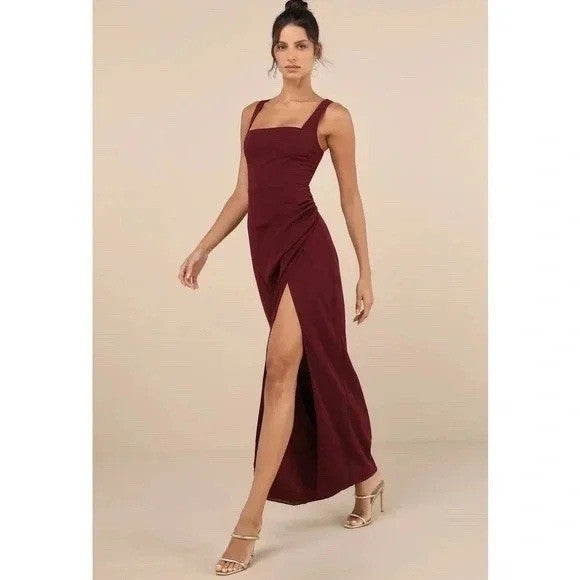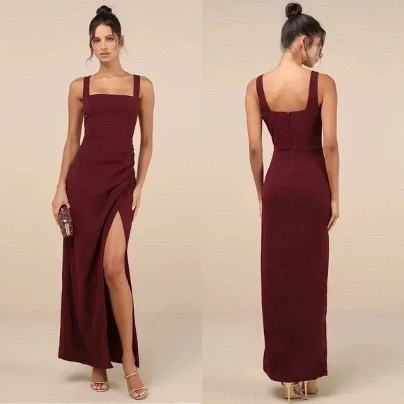 Chic midi dress in a rust red hue, perfect for various occasions. Features a flattering square neckline, sleeveless design, and a bodycon silhouette that accentuates your curves. The dress also has a stylish ruched detail on one side, adding a touch of sophistication and visual interest. A midi length and subtle slit completes the look. Ideal for cocktail parties, date nights, or a special evening event.