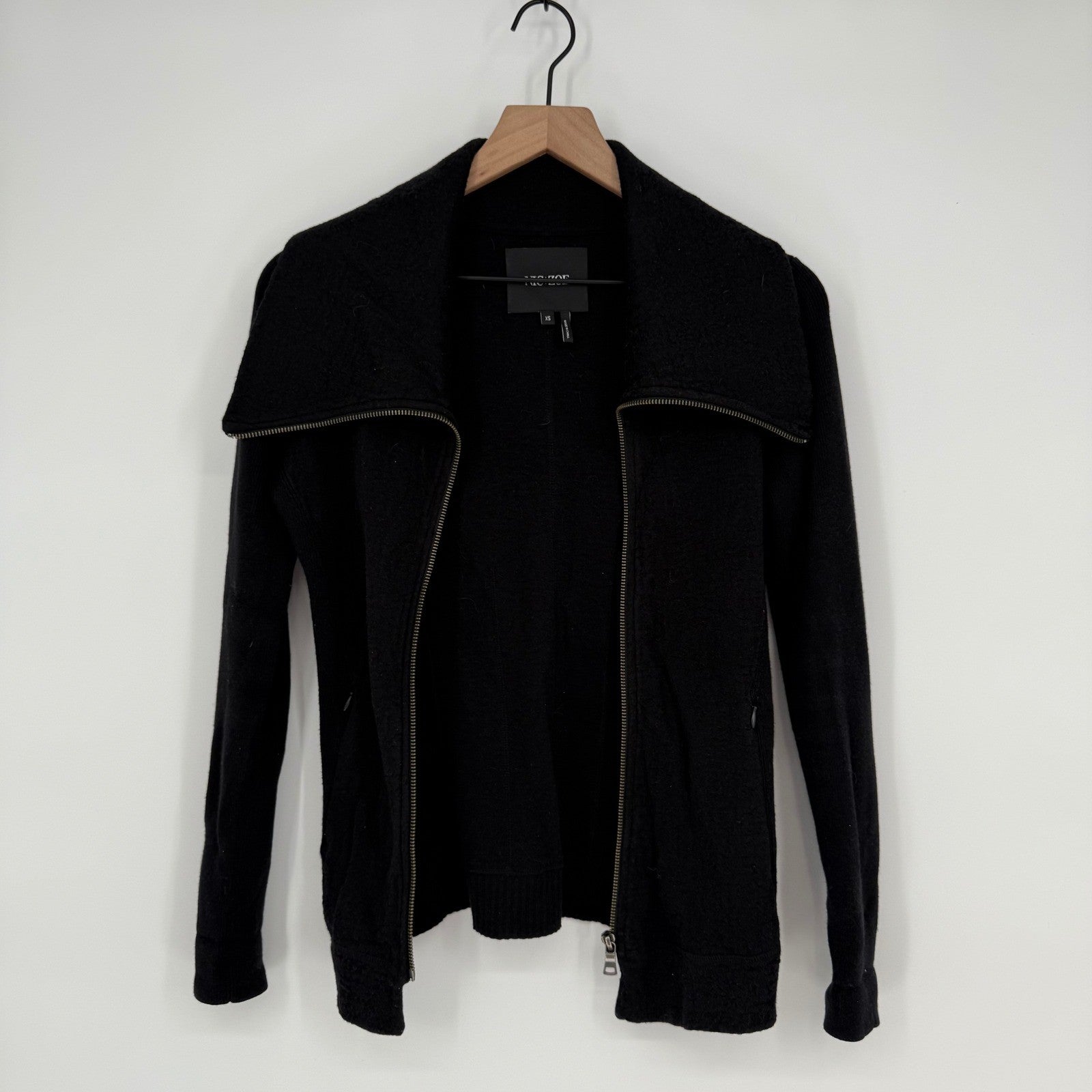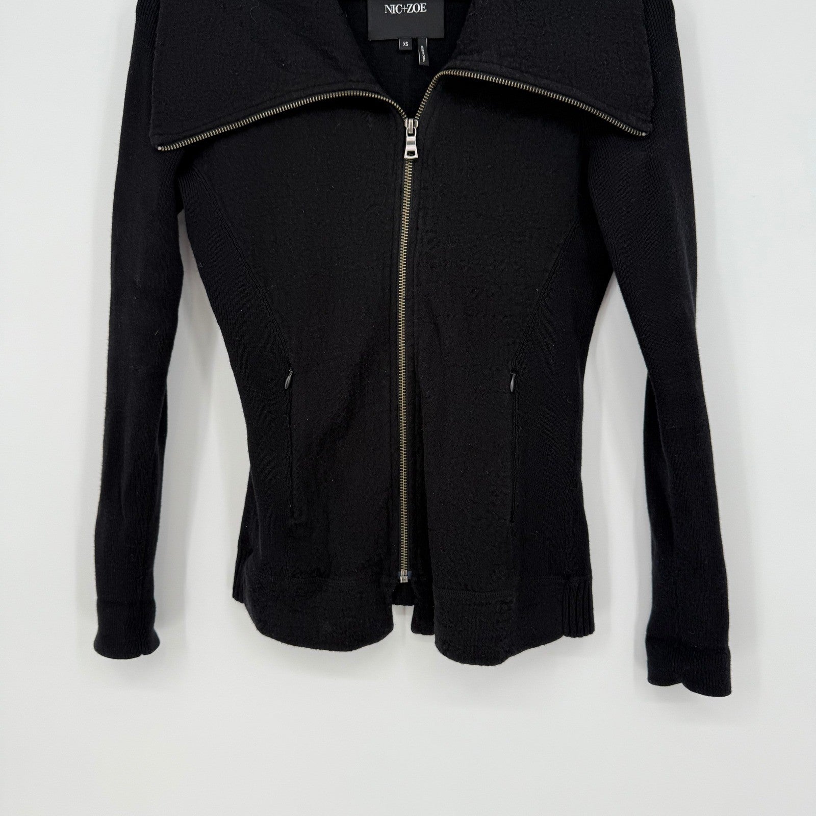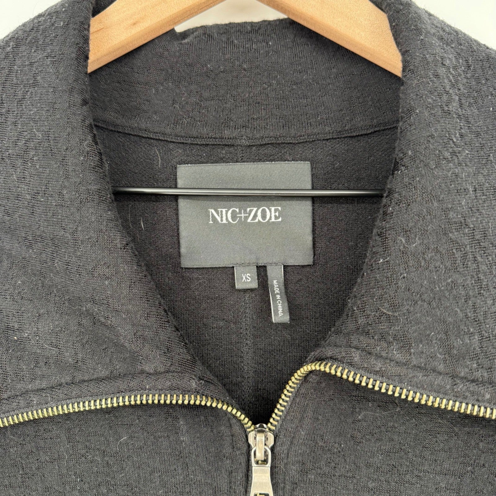 Keywords: NIC+ZOE, knit jacket, zipper collar, black sweater, XS size, layering piece, casual wear, office attire, travel essential, designer knitwear, modern style, comfortable fit