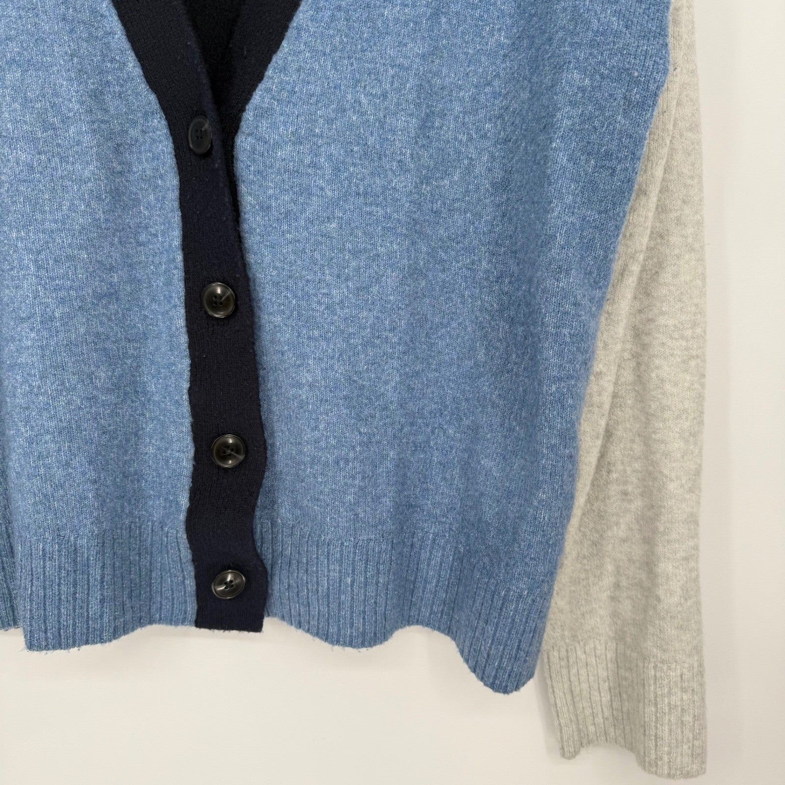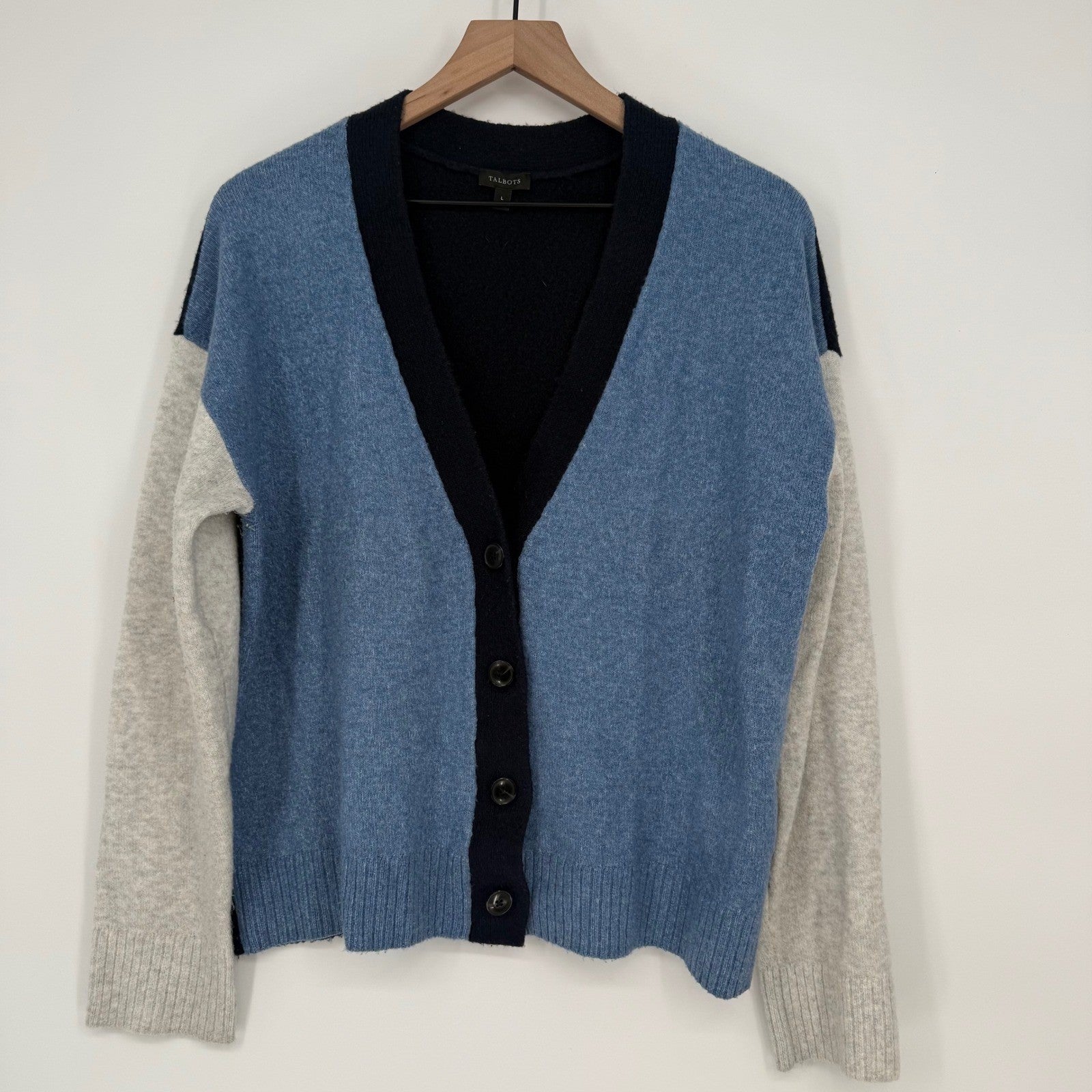 Keywords: Talbots, cardigan, sweater, color block, blue, gray, black, knit, button front, large, L, womens, classic, stylish, comfortable