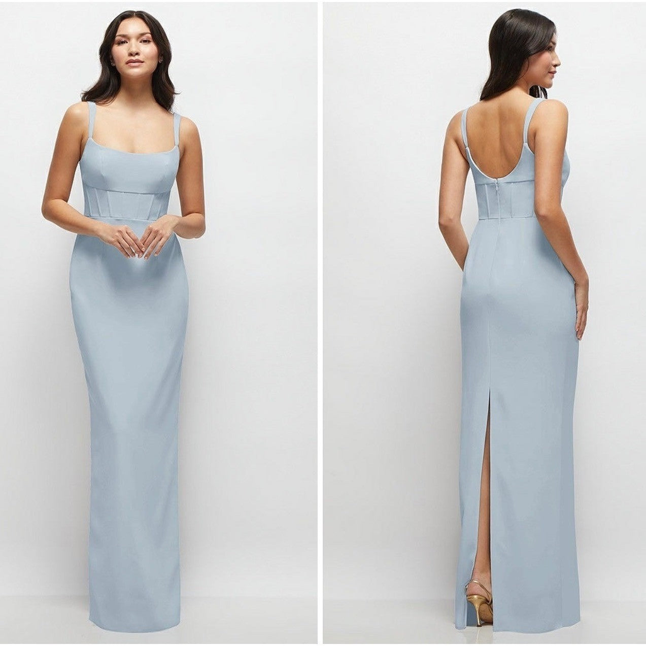 Keywords: Thread Dress, Crepe Dress, Corset Dress, Fit and Flare Dress, Maxi Dress, Formal Dress, Evening Dress, Wedding Guest Dress, Bridesmaid Dress, Mist Color Dress, Size 4 Dress, Spaghetti Strap Dress, Inset Corset Dress, Flowy Dress, Elegant Dress
